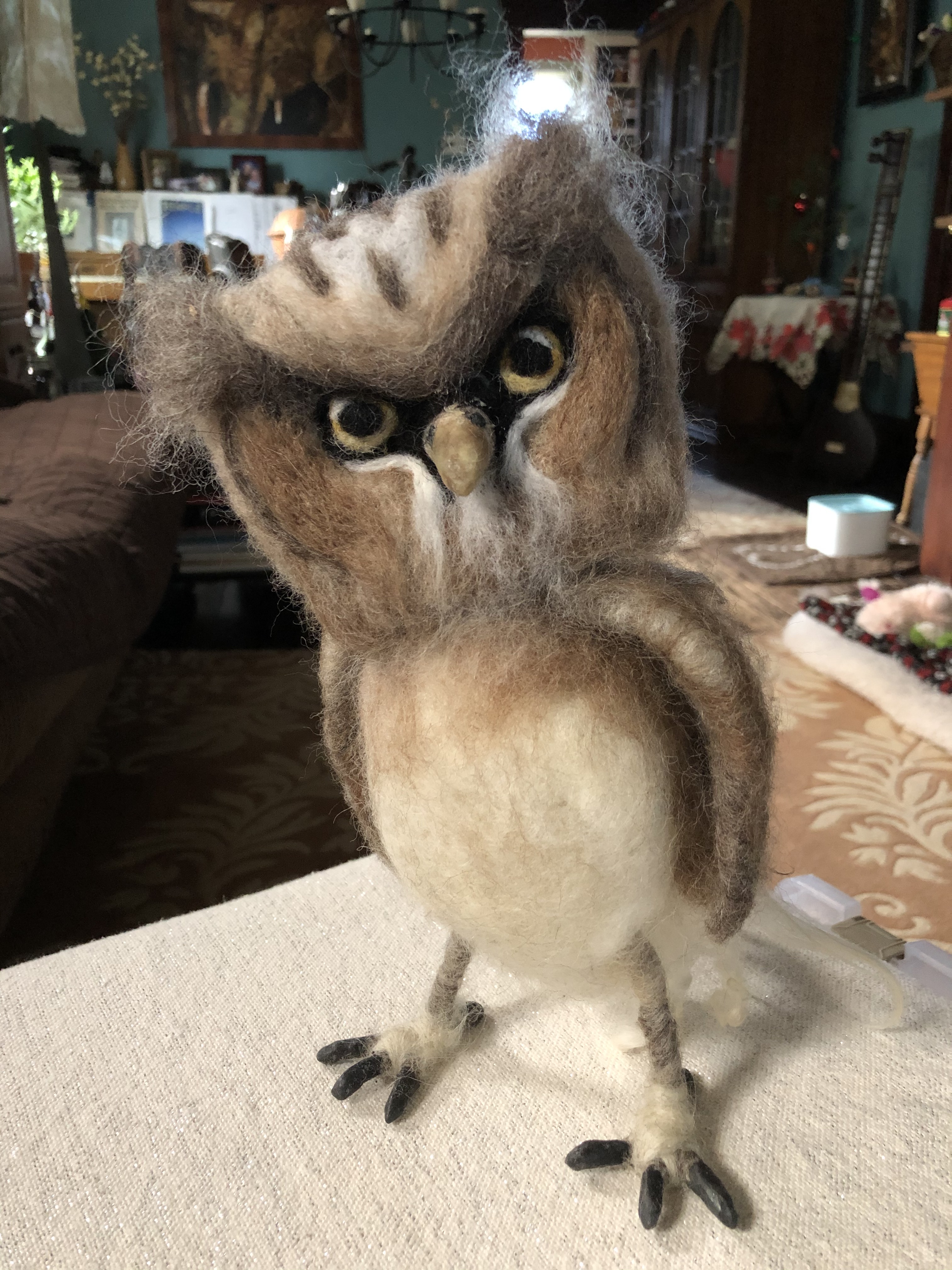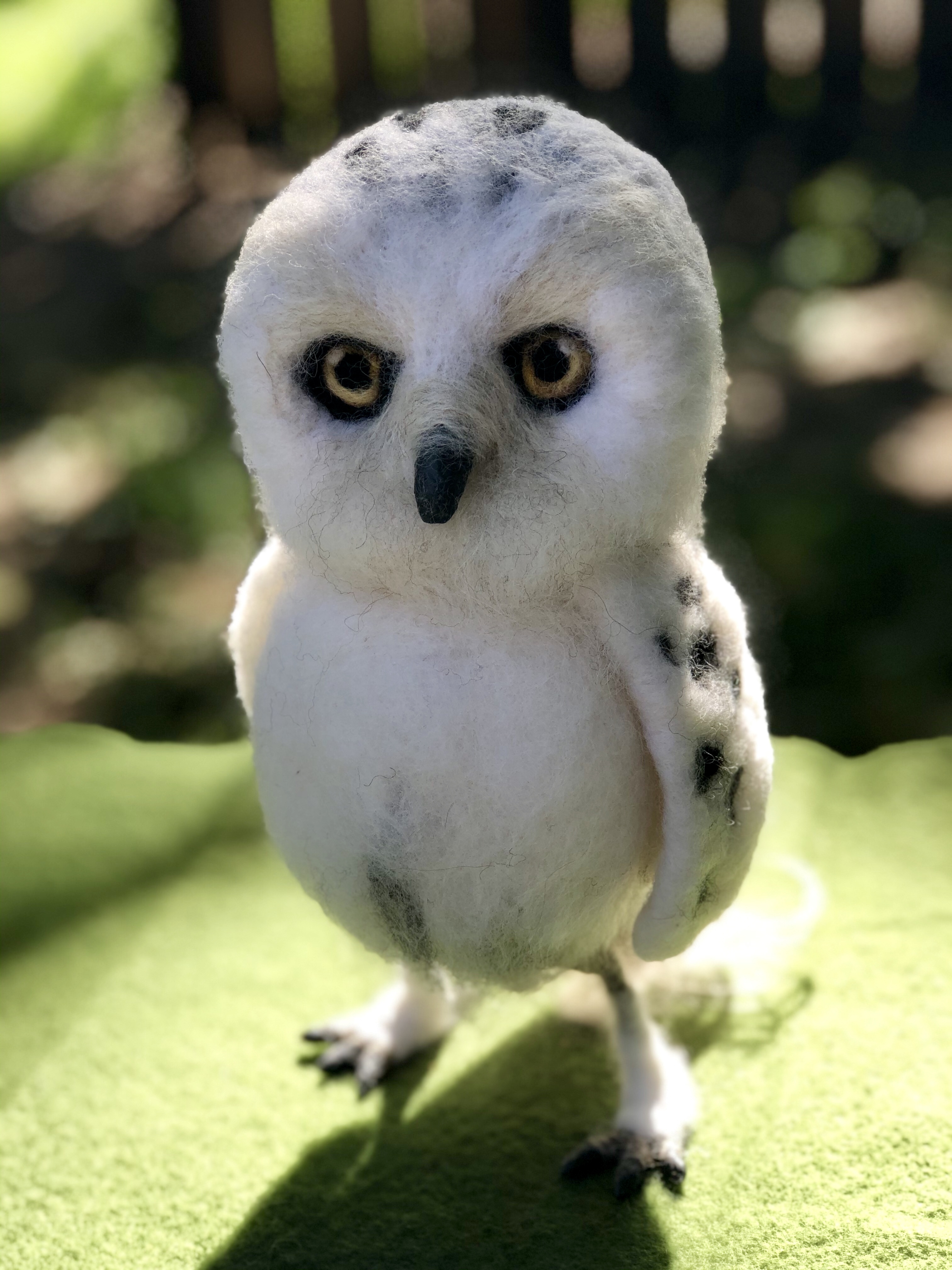 Needle felted baby owls modeled after the Sarafina Fiber Art baby owl. Great horned and snowy owls. Wool over a wire armature.