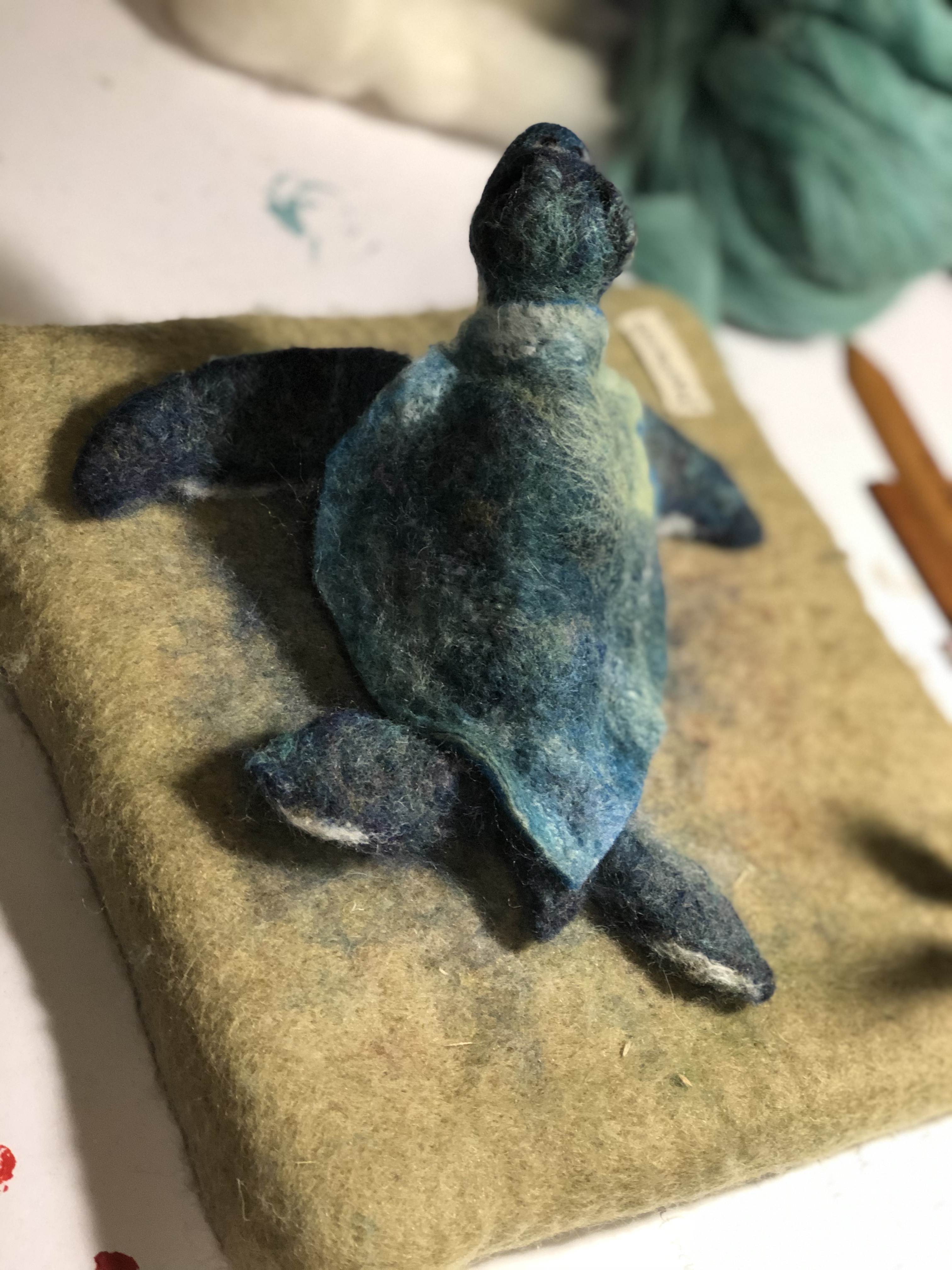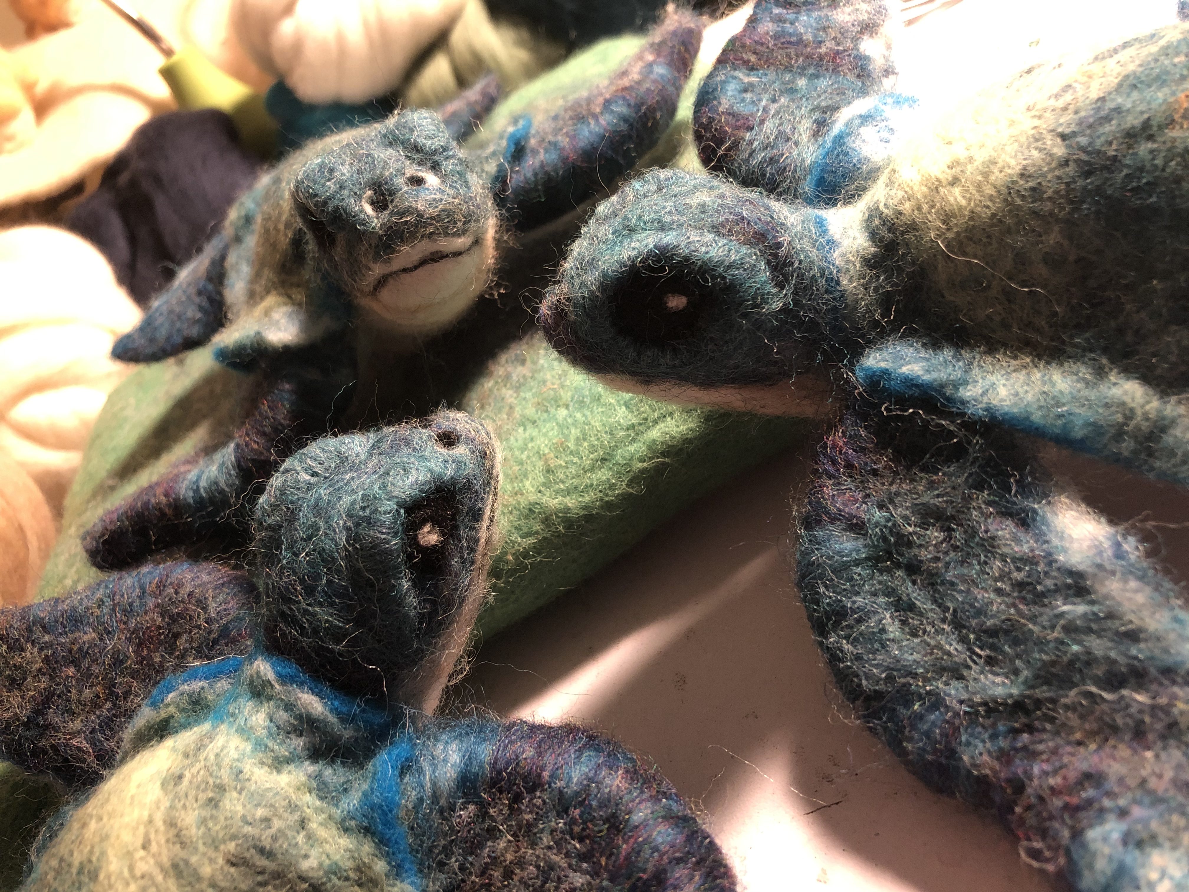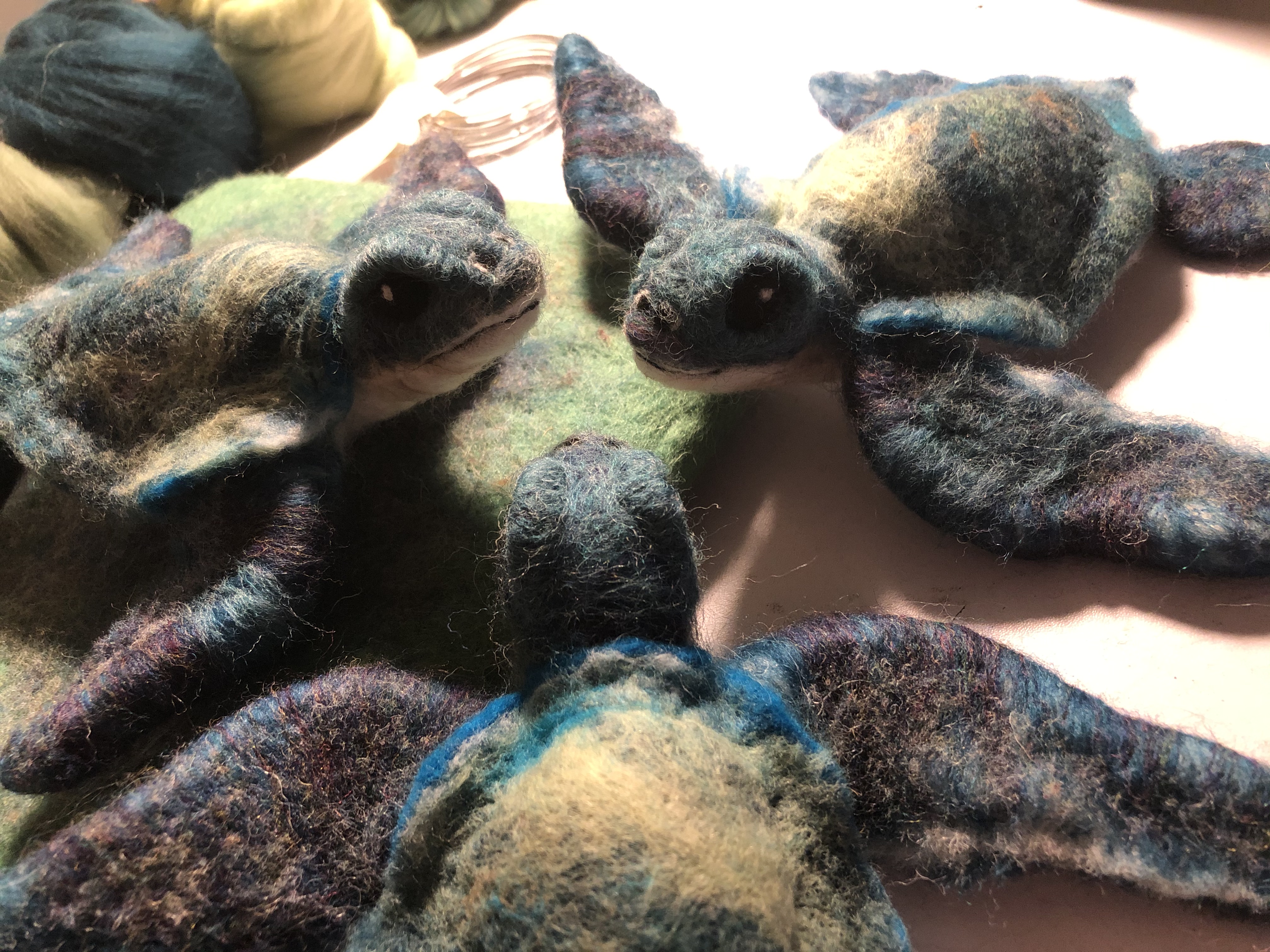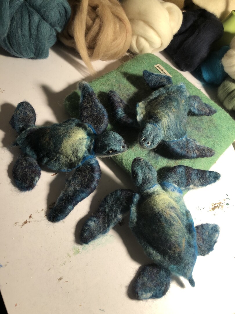 Baby sea turtles made for and inspired by some wonderful times and great friends in Vero Beach. Wool over a wire armature. Shells were wet felted; bodies and heads were needle felted.