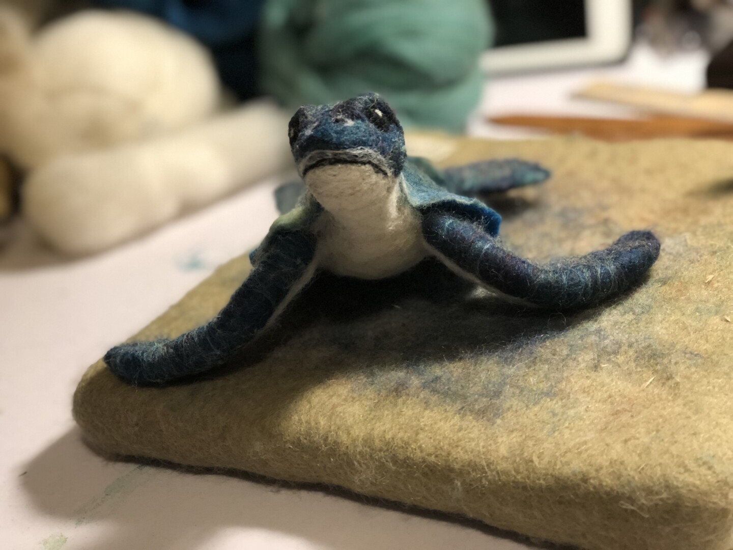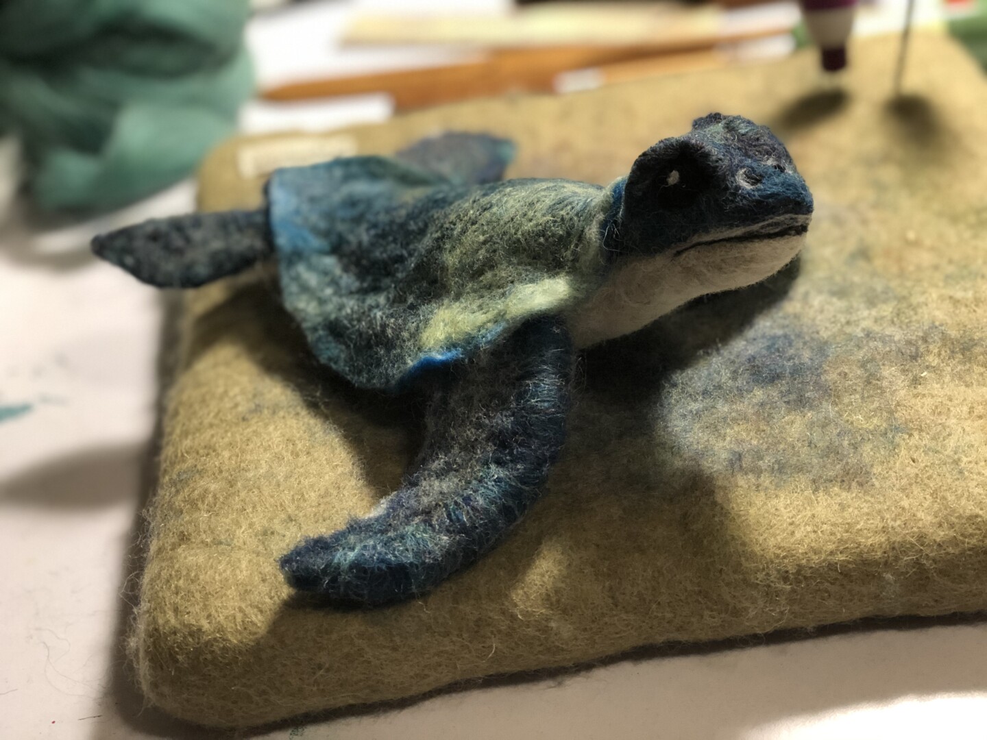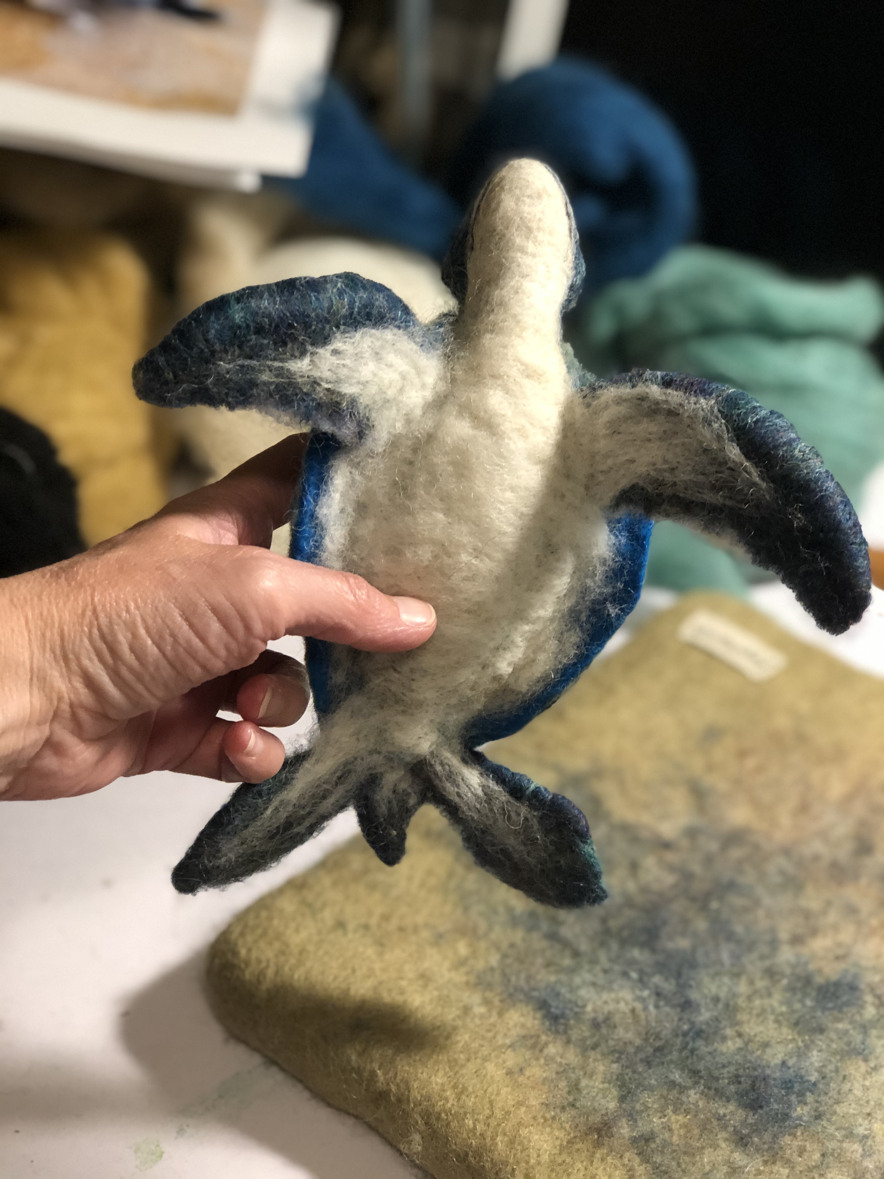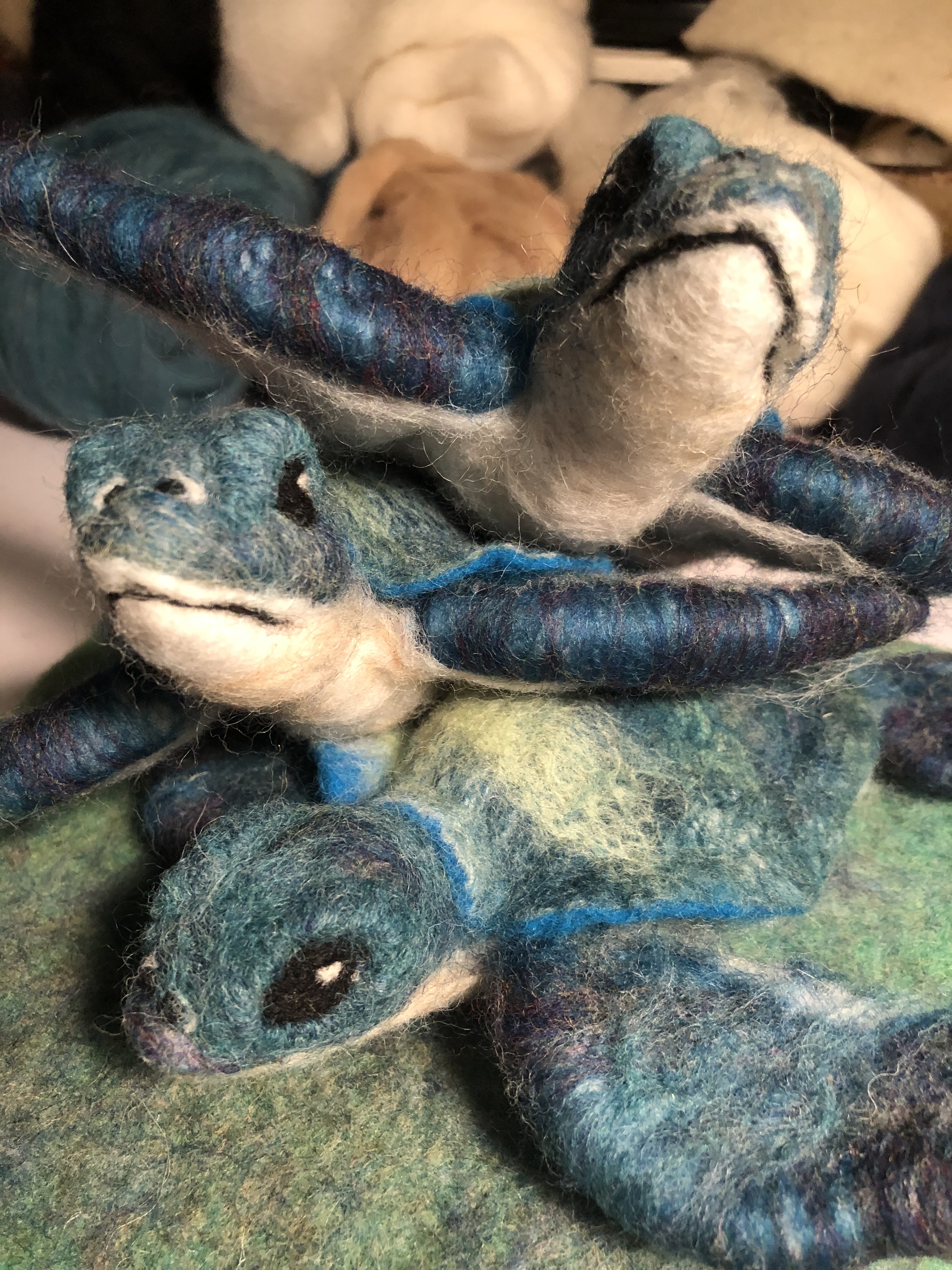 Baby sea turtles made for and inspired by some wonderful times and great friends in Vero Beach. Wool over a wire armature. Shells were wet felted; bodies and heads were needle felted.