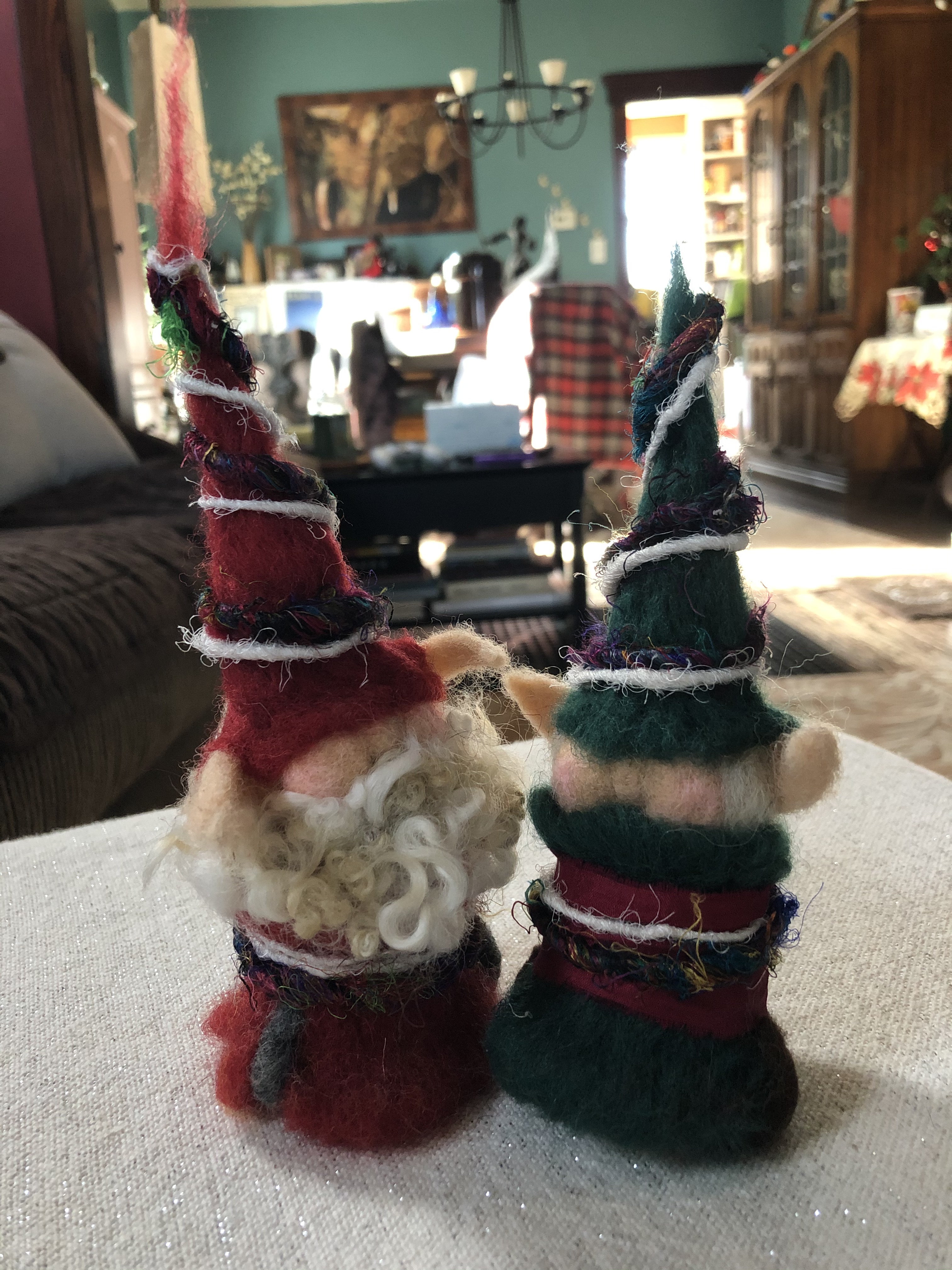 Needle felted wool elf ornaments in the likeness of Santa and Mrs. Claus.