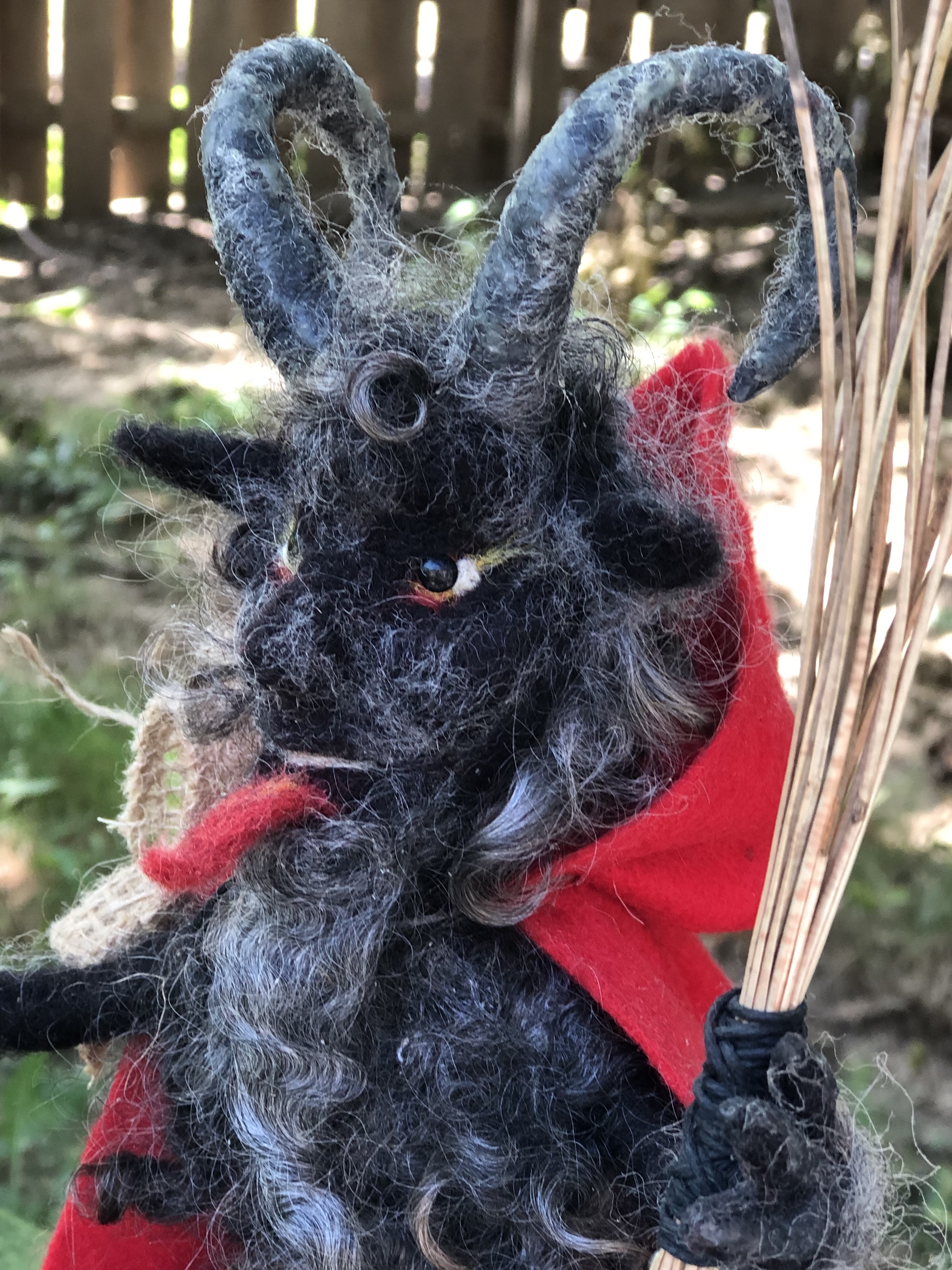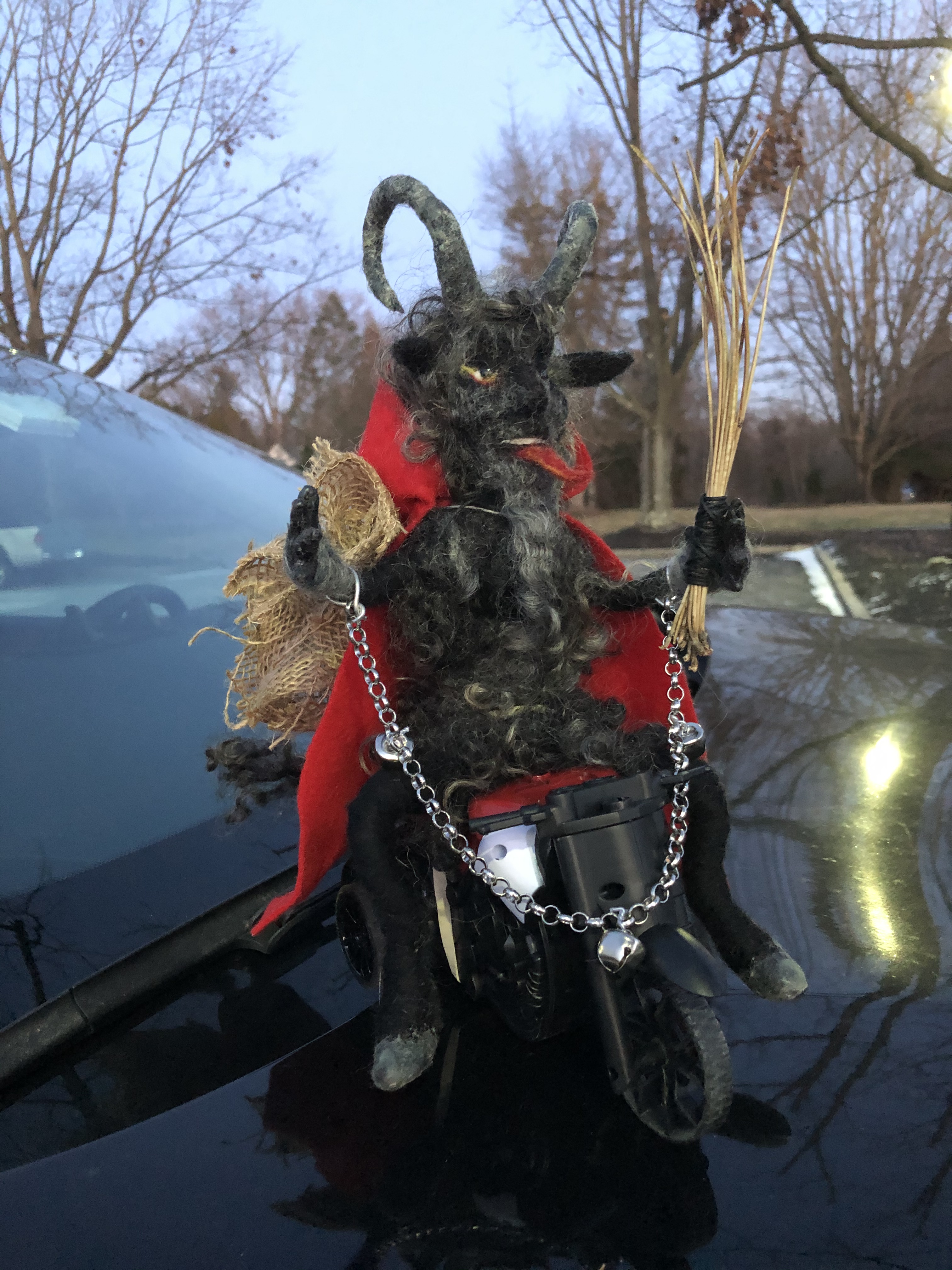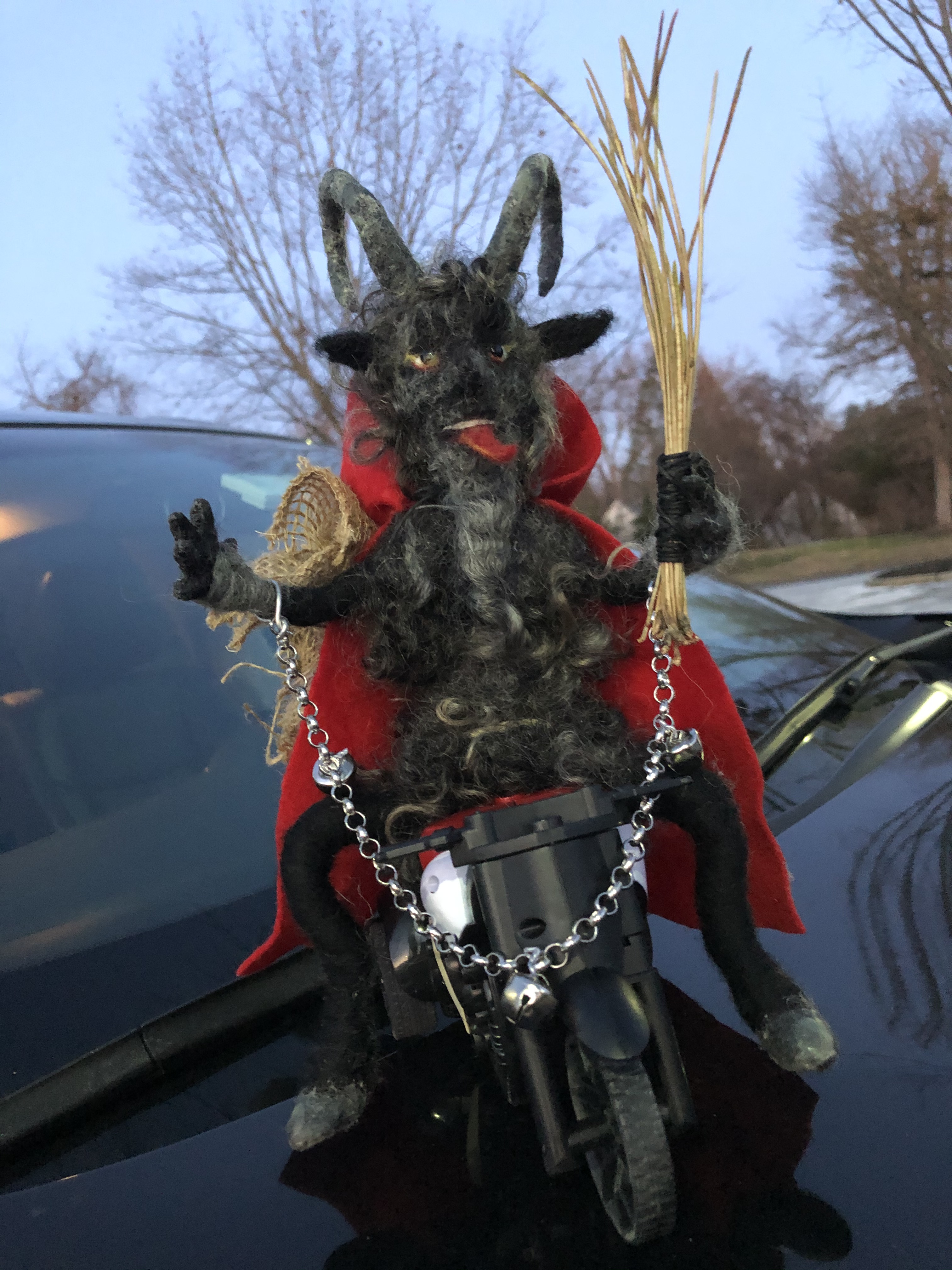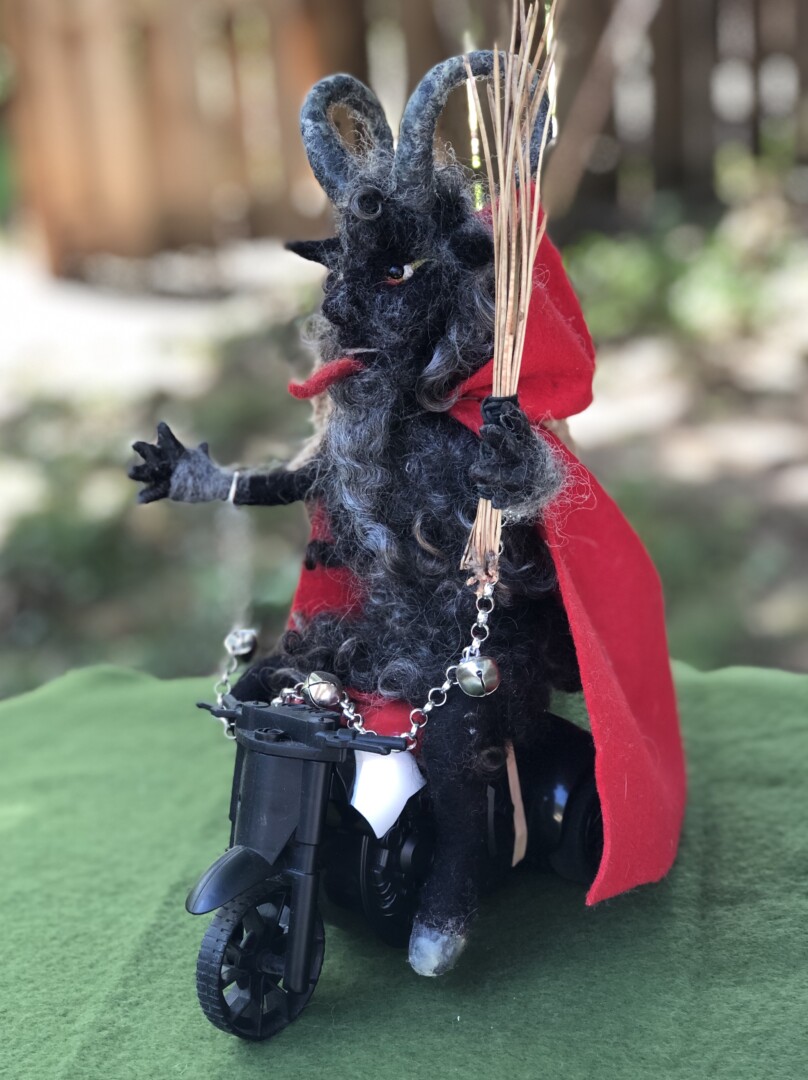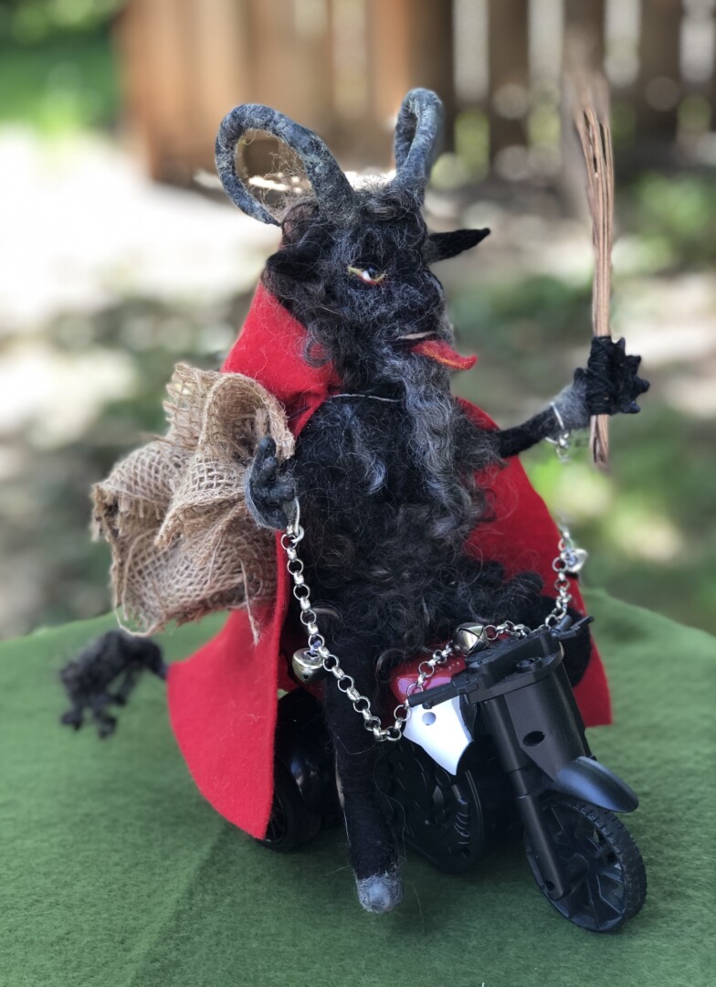 Needle felted Krampus sculpture representing the half goat, half demon character that would punish bad children during the Christmas season. This version of Krampus is wool over a wire armature, seated on a remote controlled motorcycle with pine needle whip, and metal chain with bells.