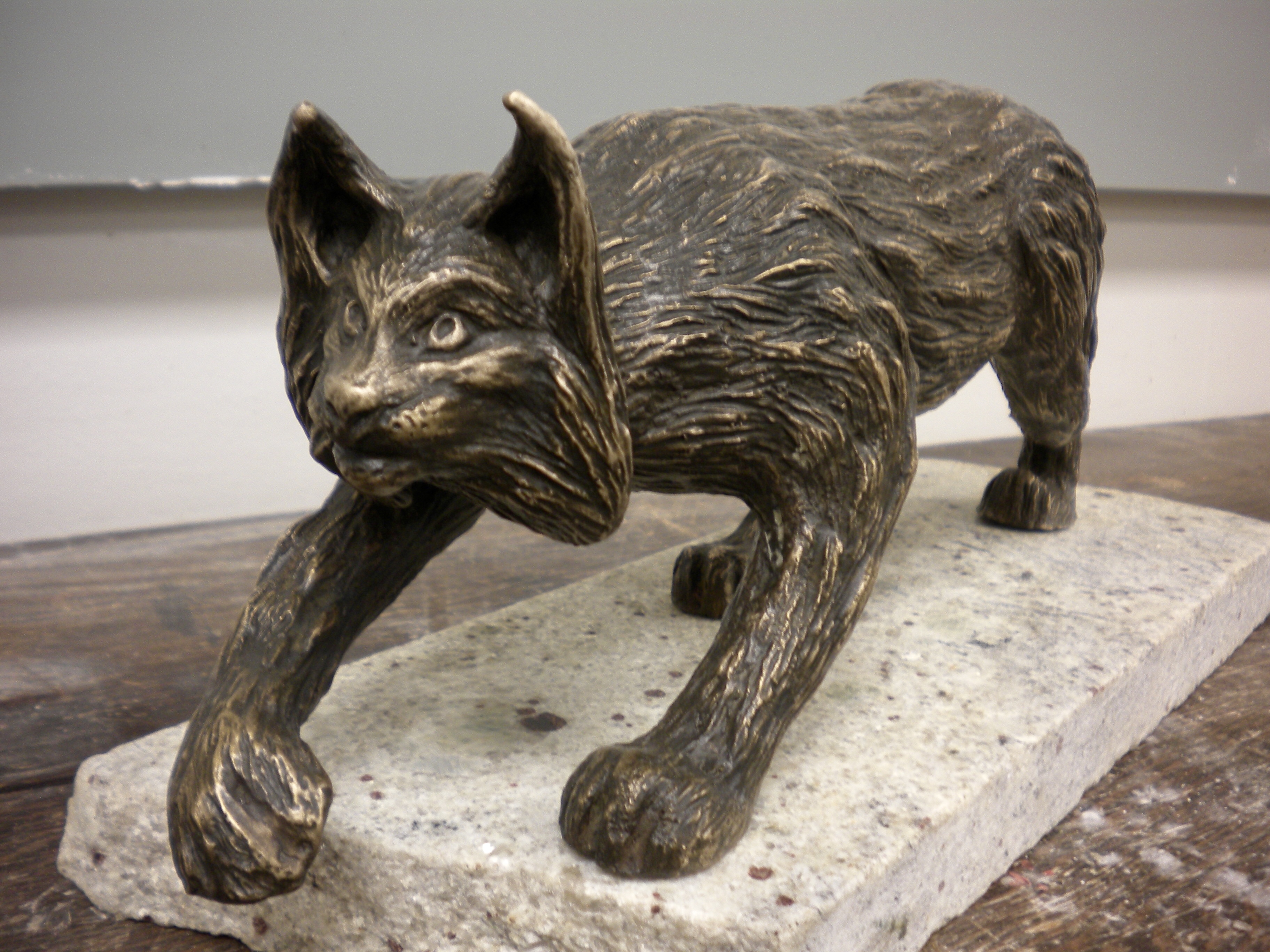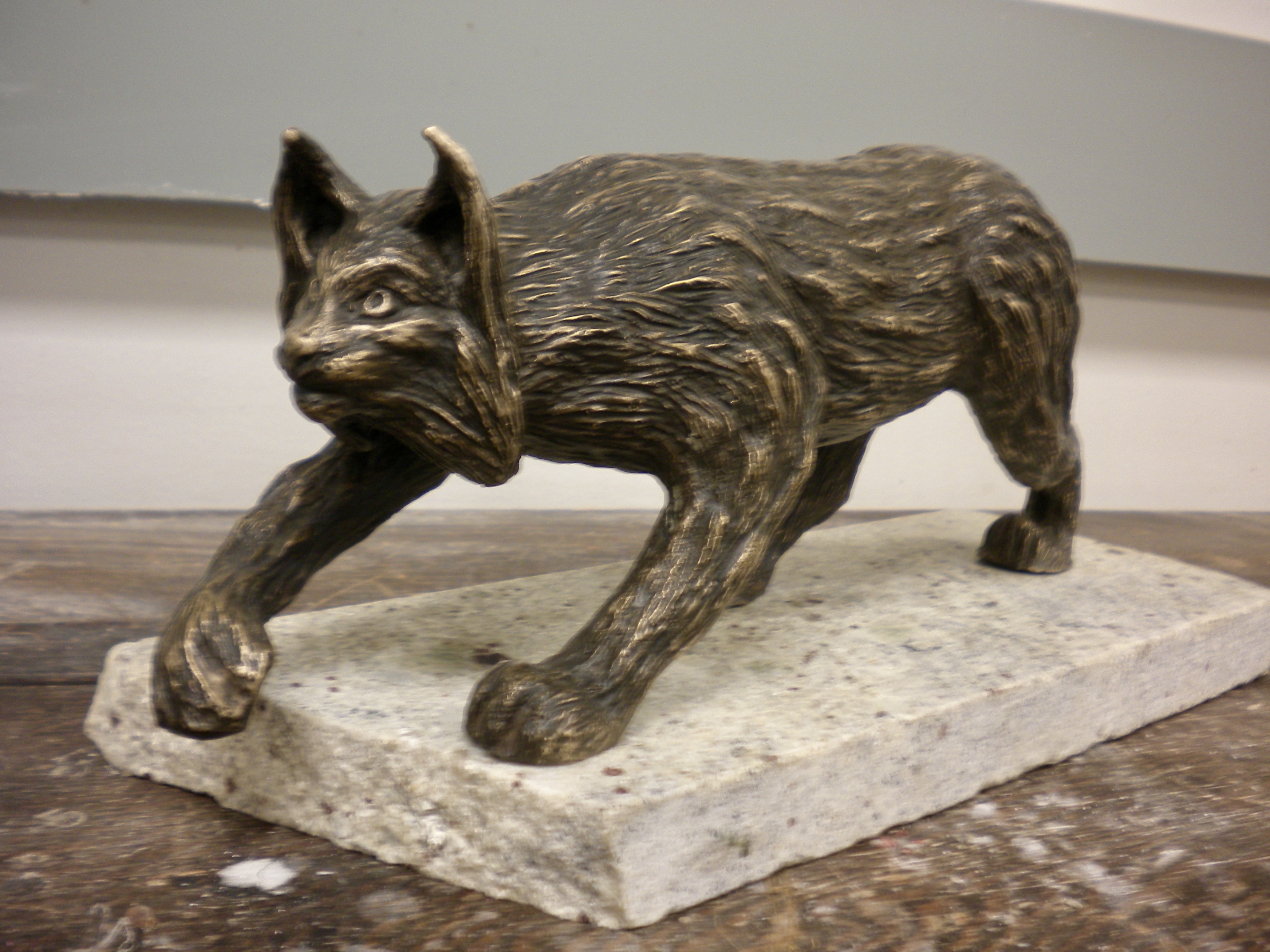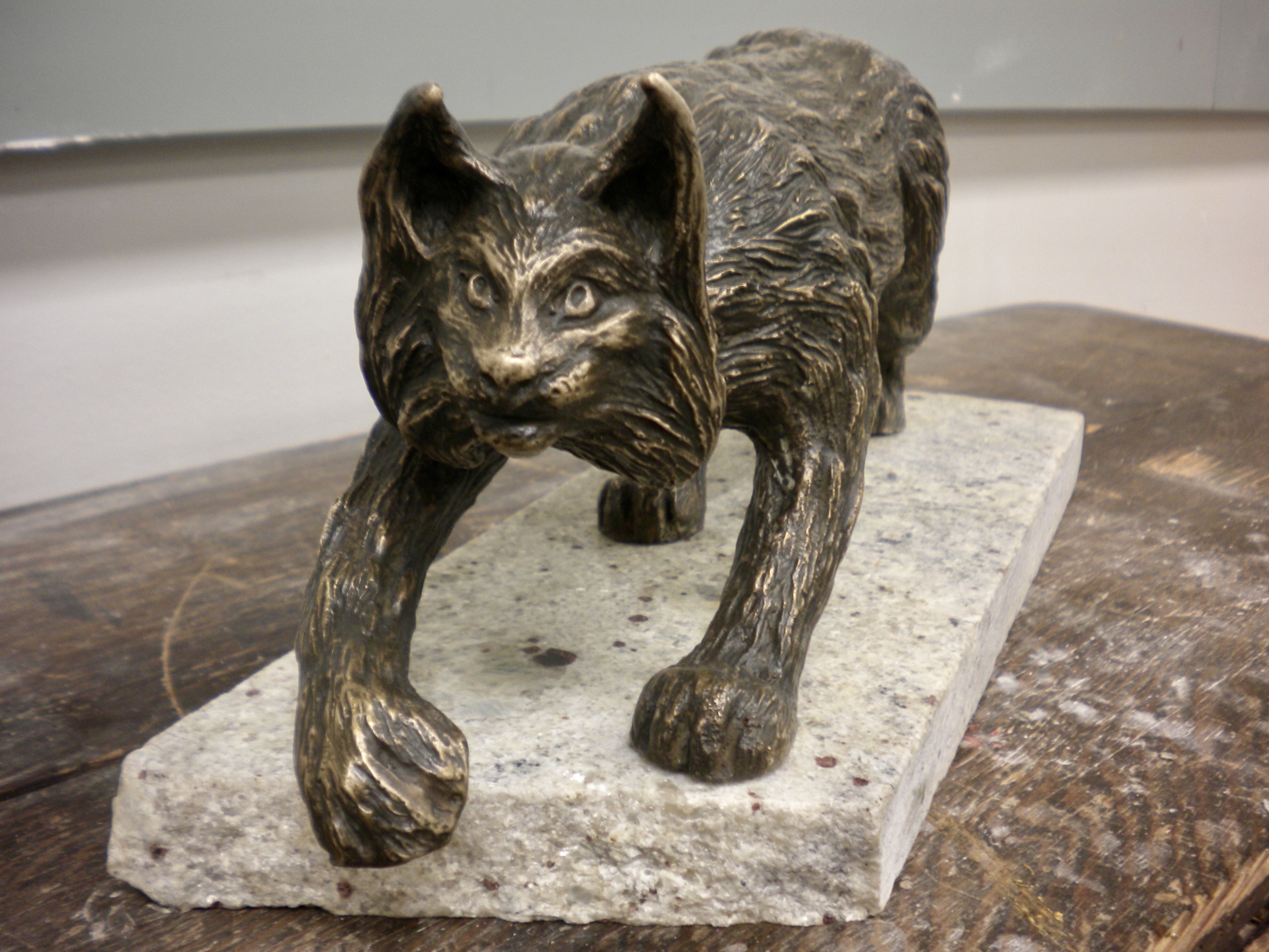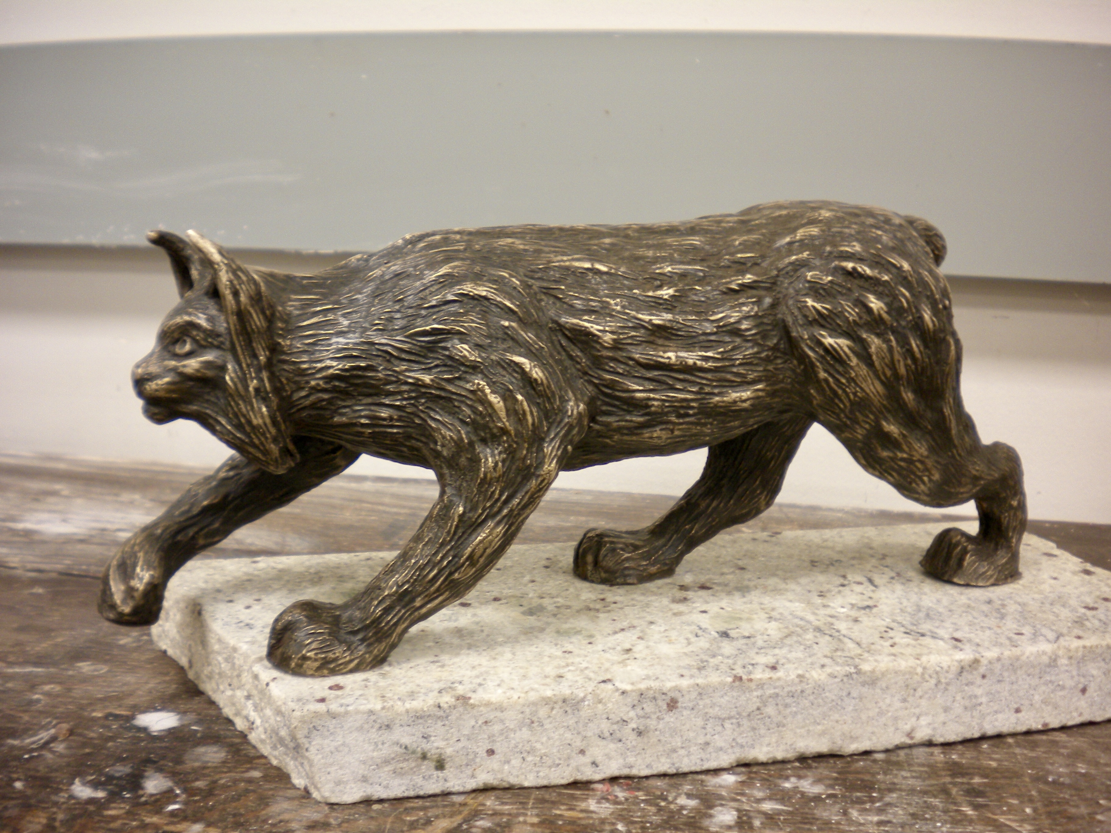 Bronze sculpture of a lynx mounted on granite. Second lynx is still in progress.