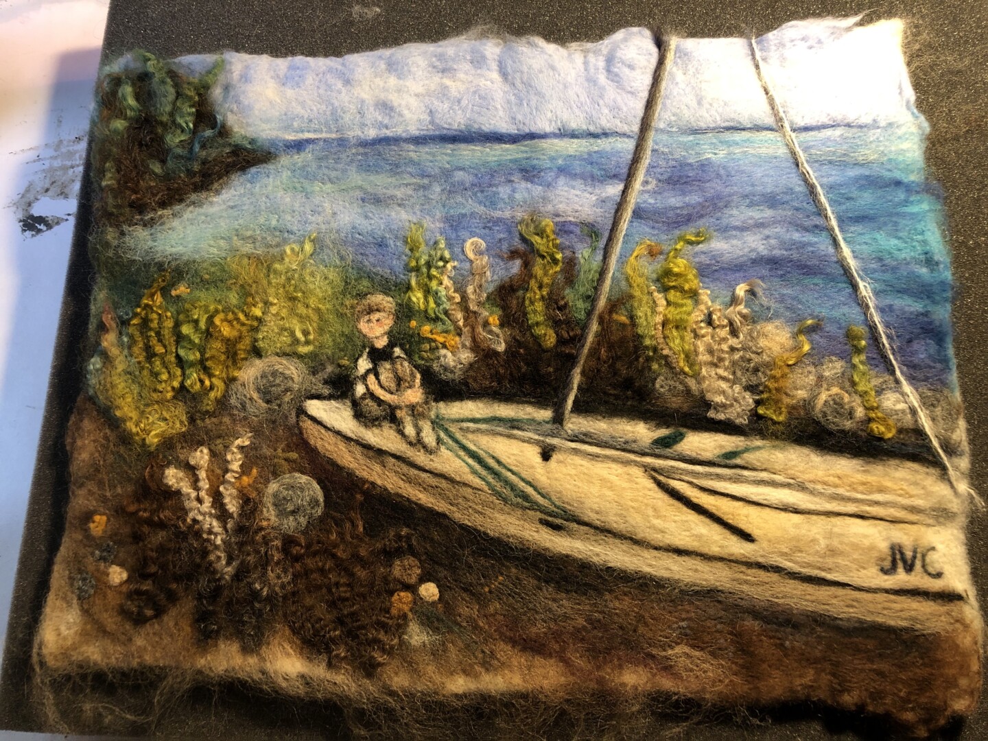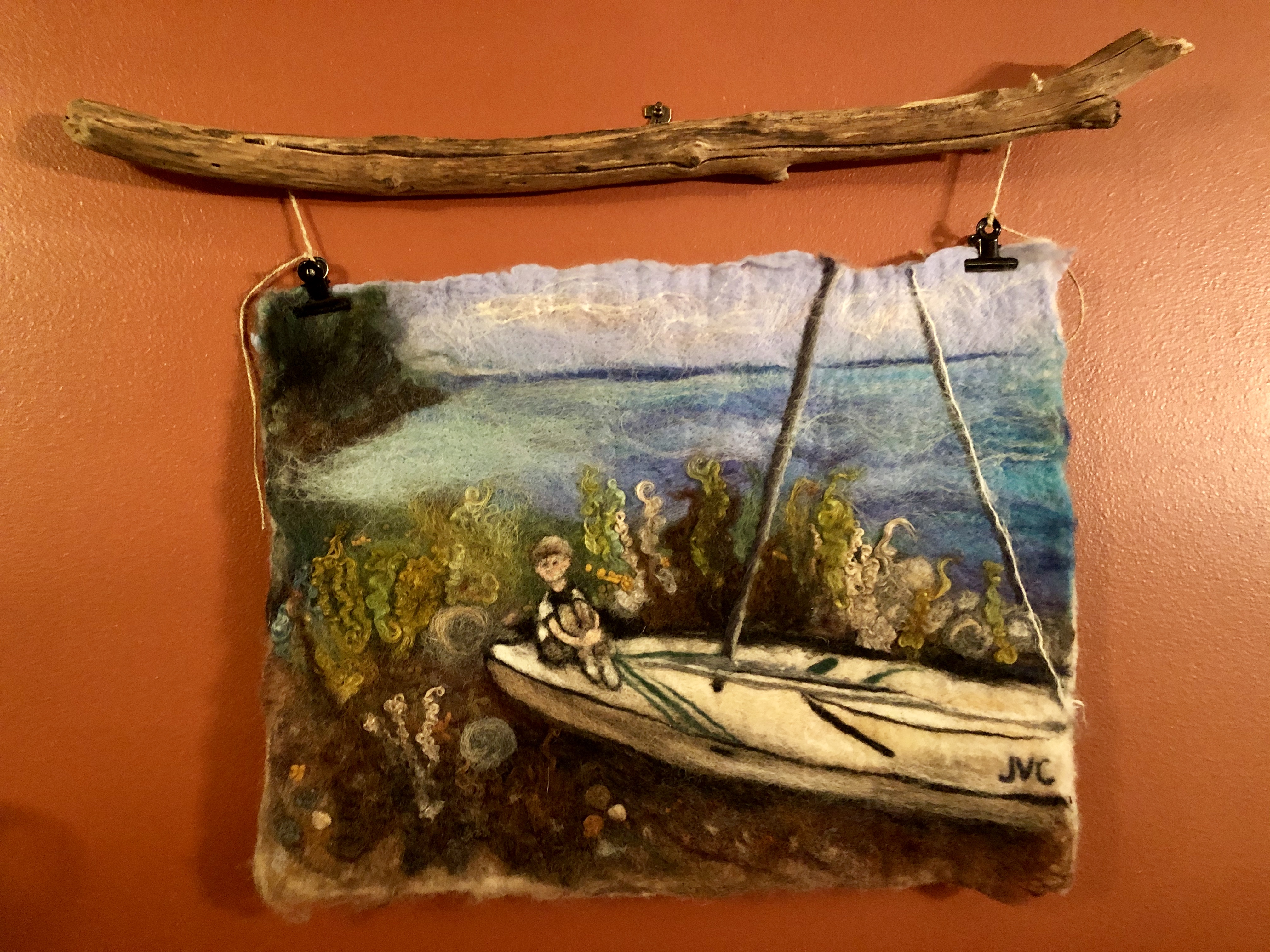 This was a gift for my father. It’s an image of my brother, Neal, sitting on a sailboat on the shore of Lake Champlain when we were younger. This is a place that holds many fond memories of growing up for each and everyone of us. Wet and needle felted wool, wood branch, string, metal clips.