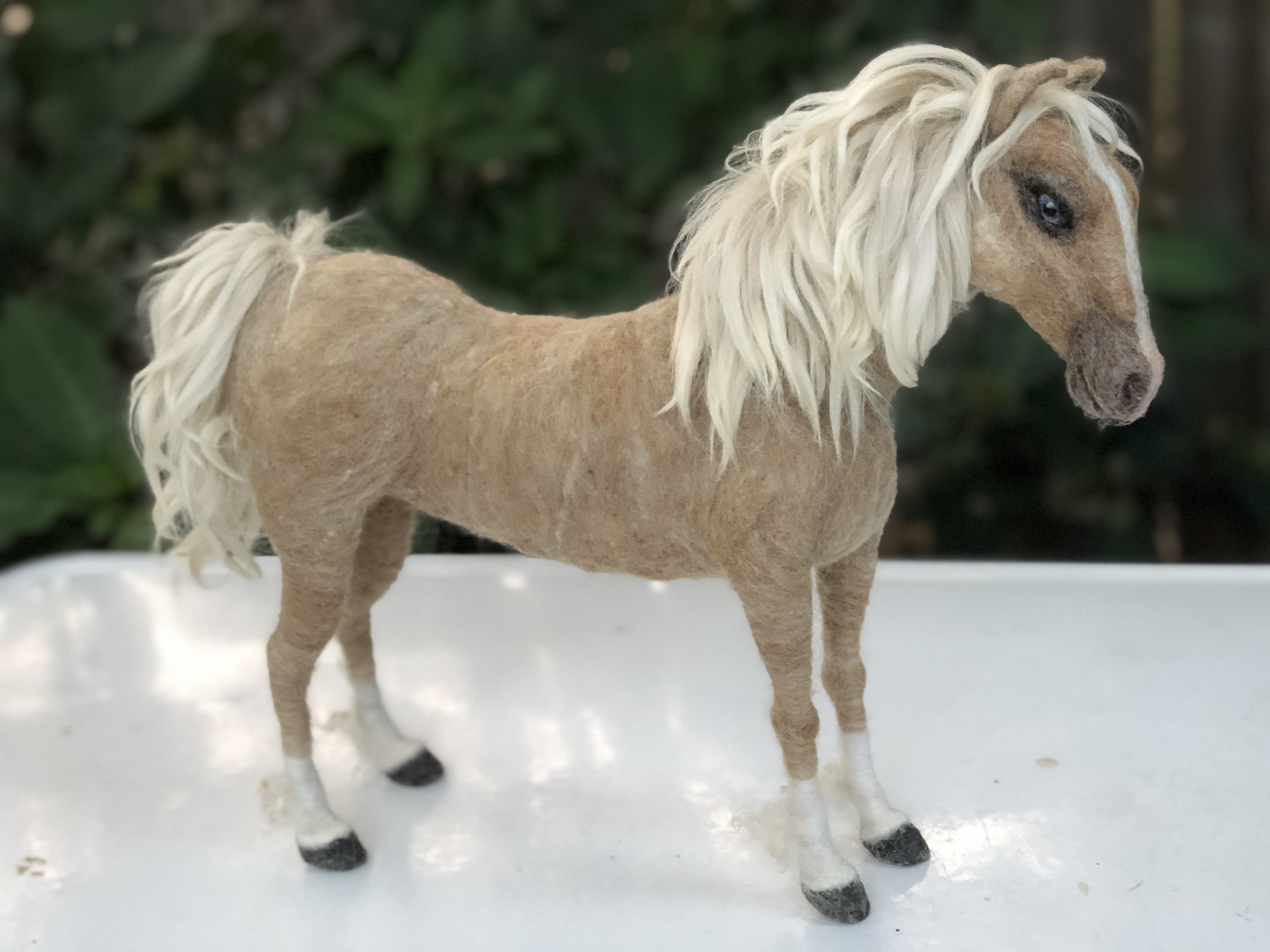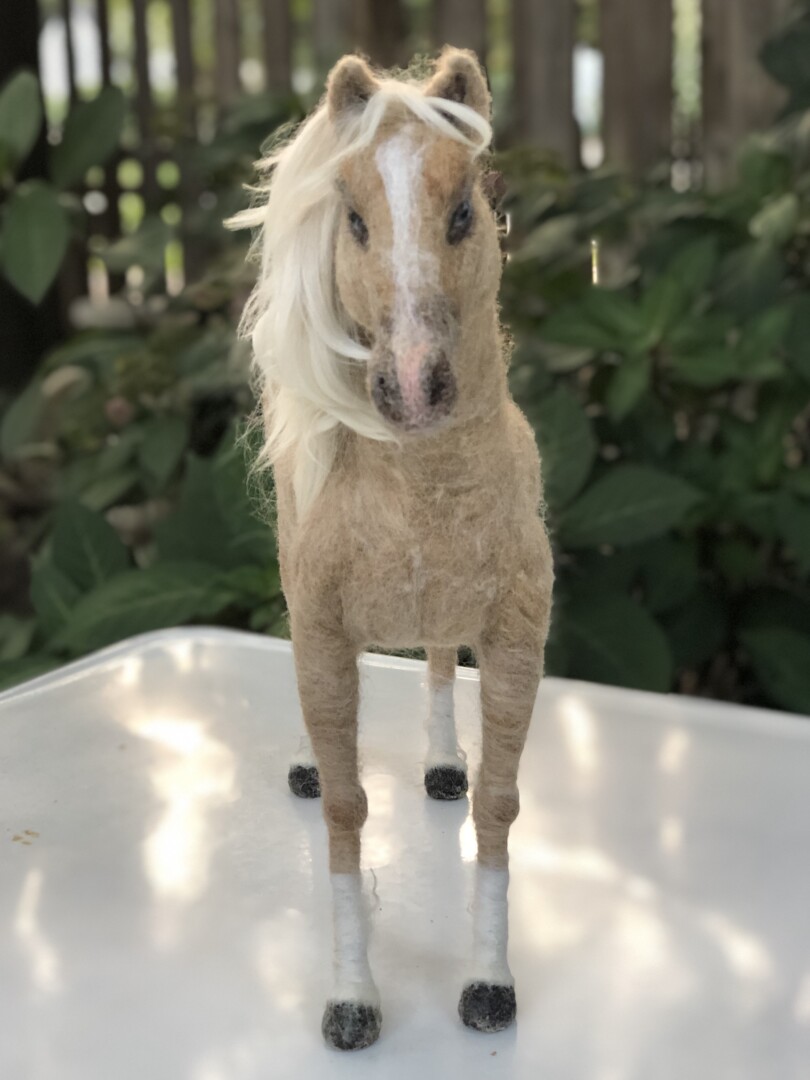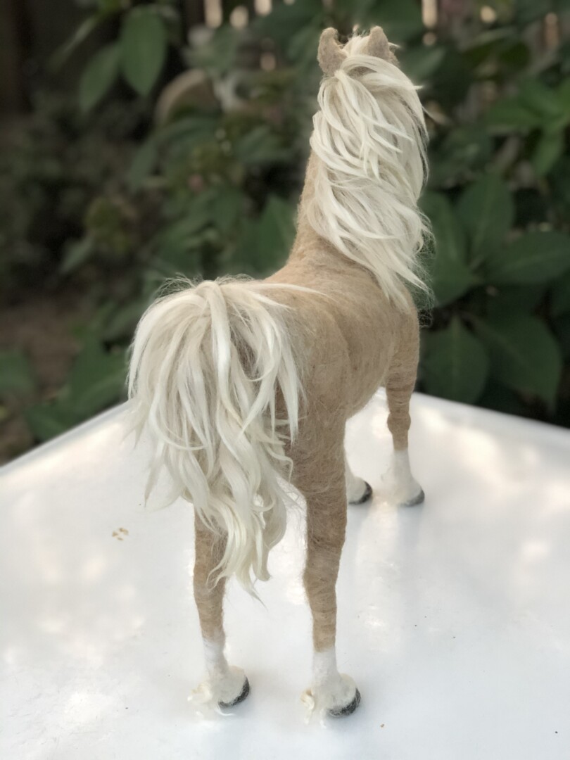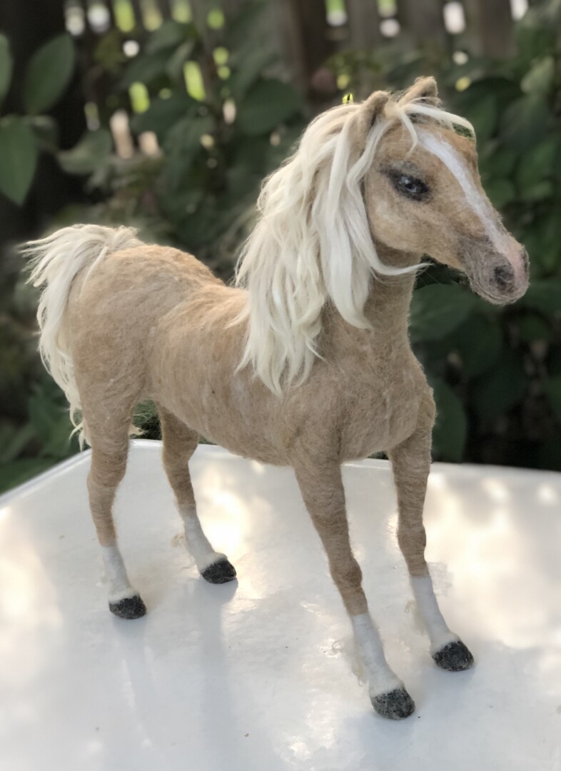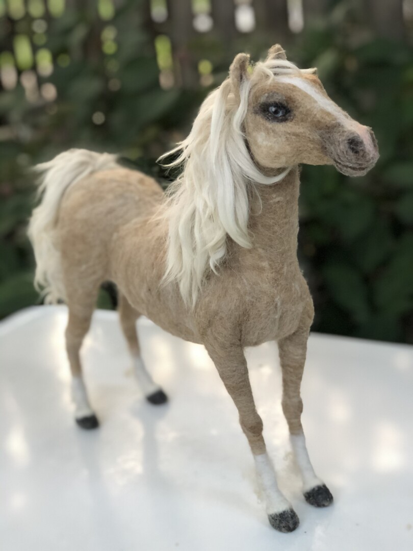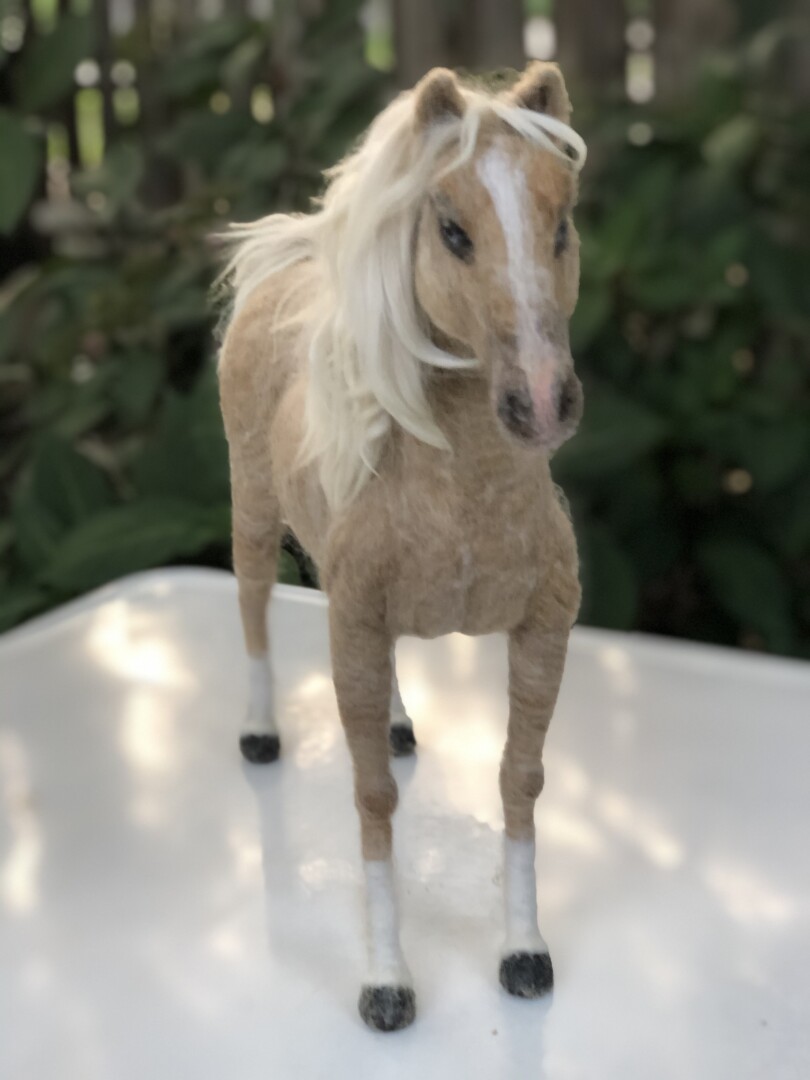 Sculpture of a blue-eyed Palomino horse made in Sara Renzulli’s “Horse Course: Armature to Tail” class during the summer of 2020. Needle felted wool over a wire armature.