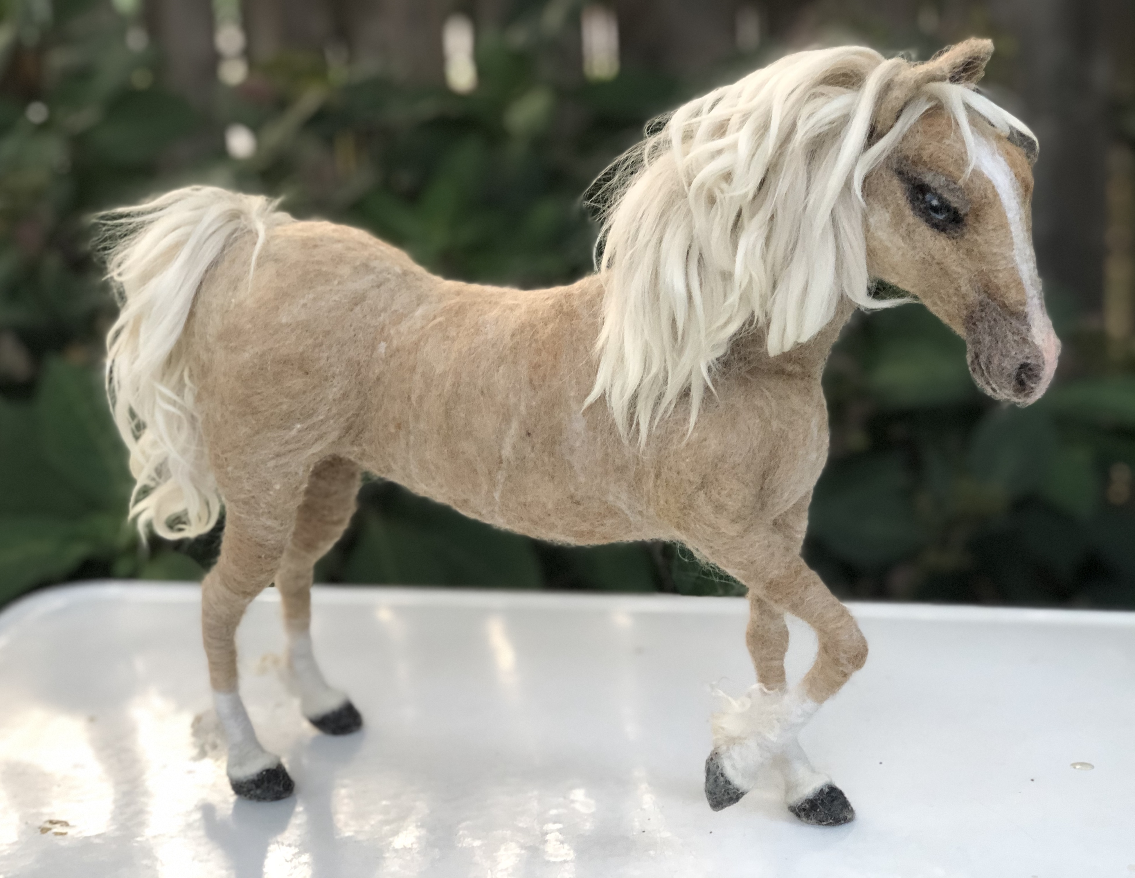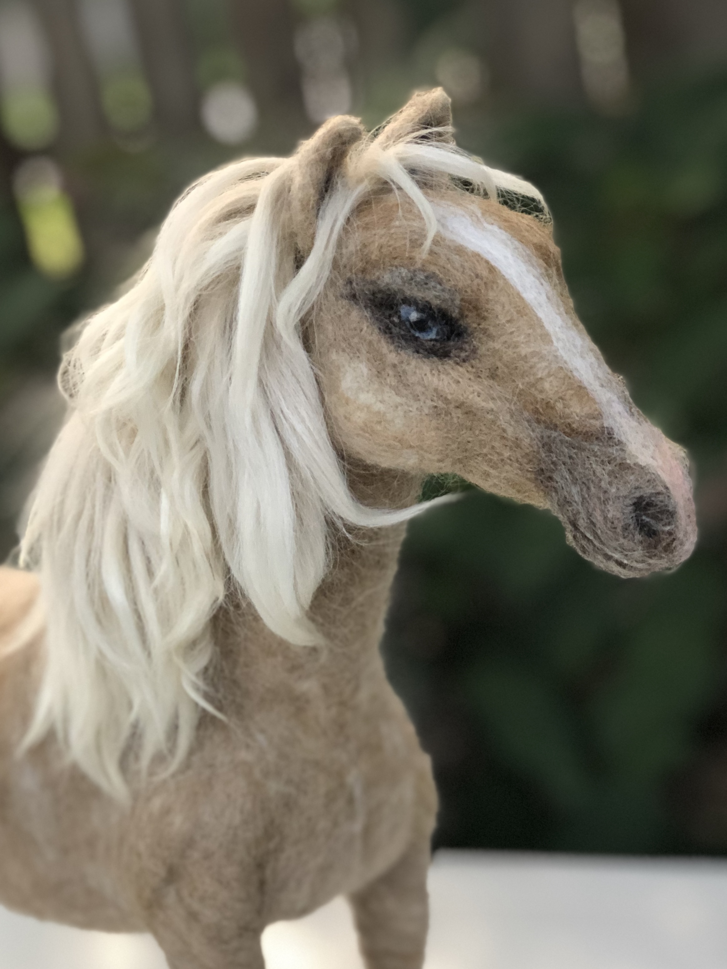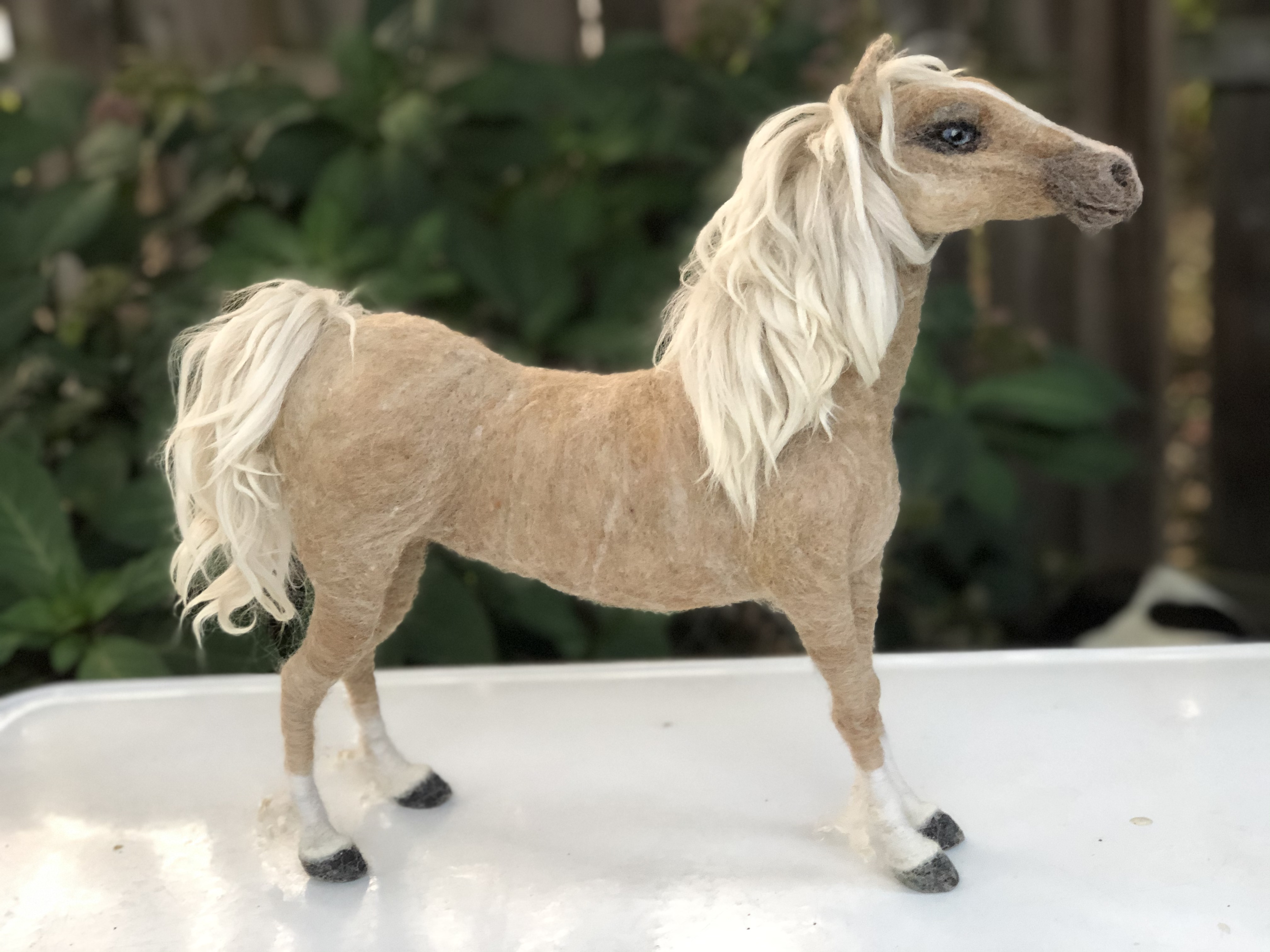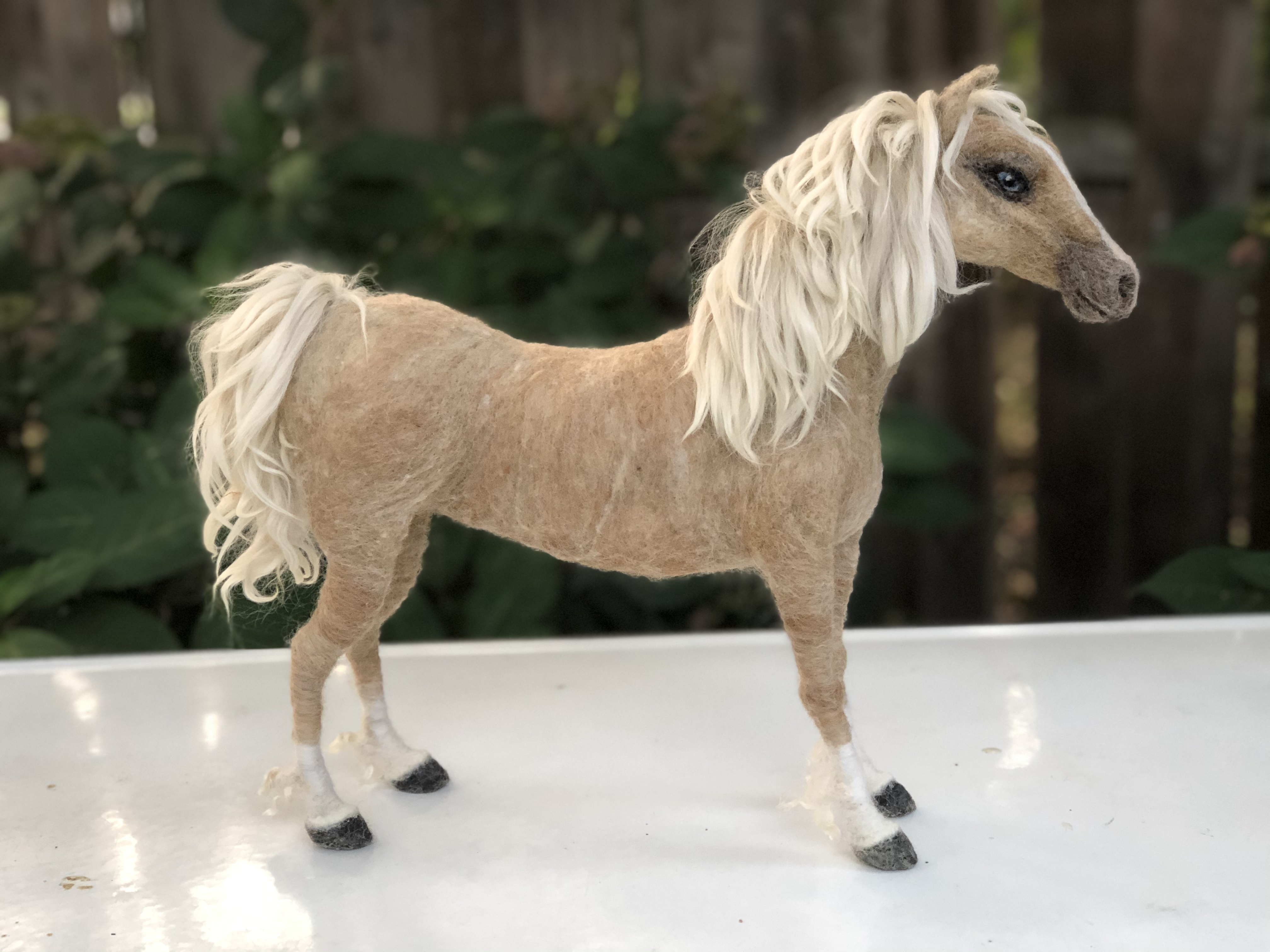 Sculpture of a blue-eyed Palomino horse made in Sara Renzulli’s “Horse Course: Armature to Tail” class during the summer of 2020. Needle felted wool over a wire armature.
