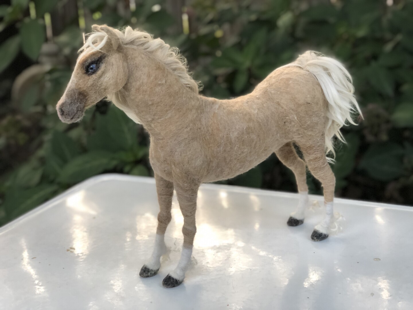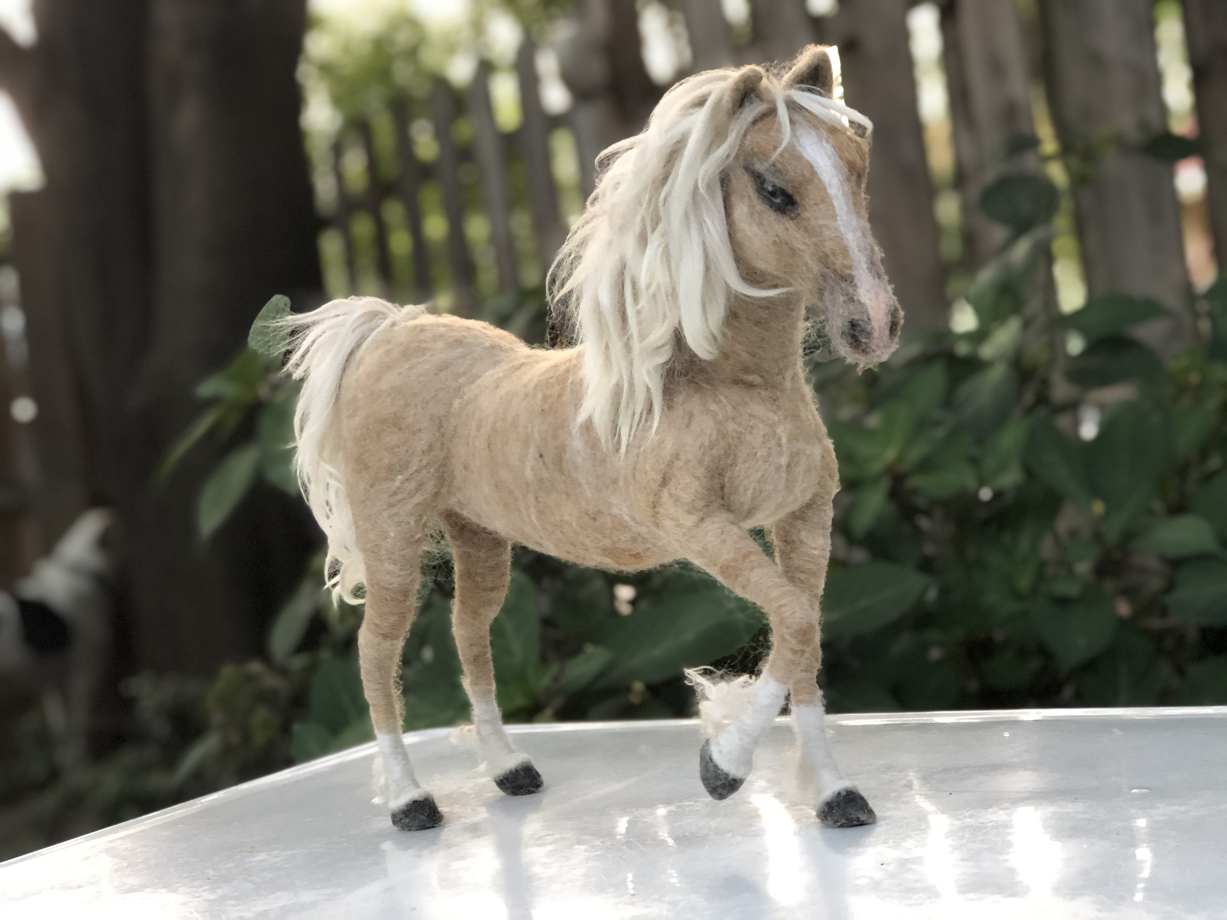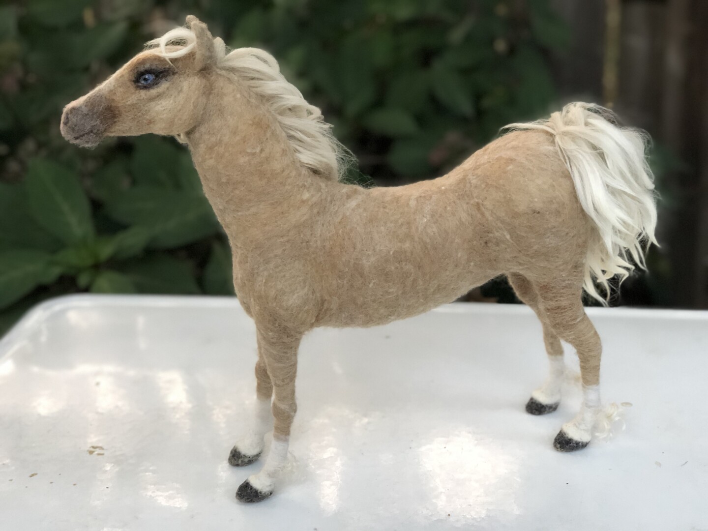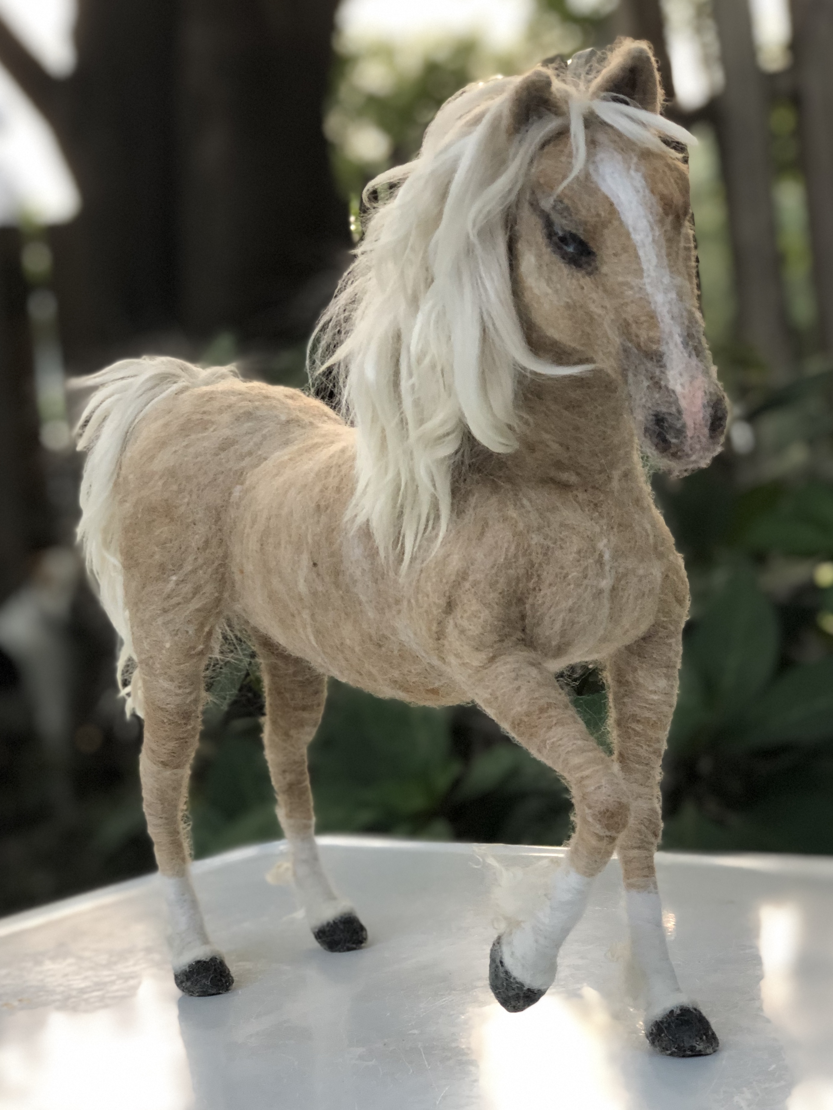 Sculpture of a blue-eyed Palomino horse made in Sara Renzulli’s “Horse Course: Armature to Tail” class during the summer of 2020. Needle felted wool over a wire armature.