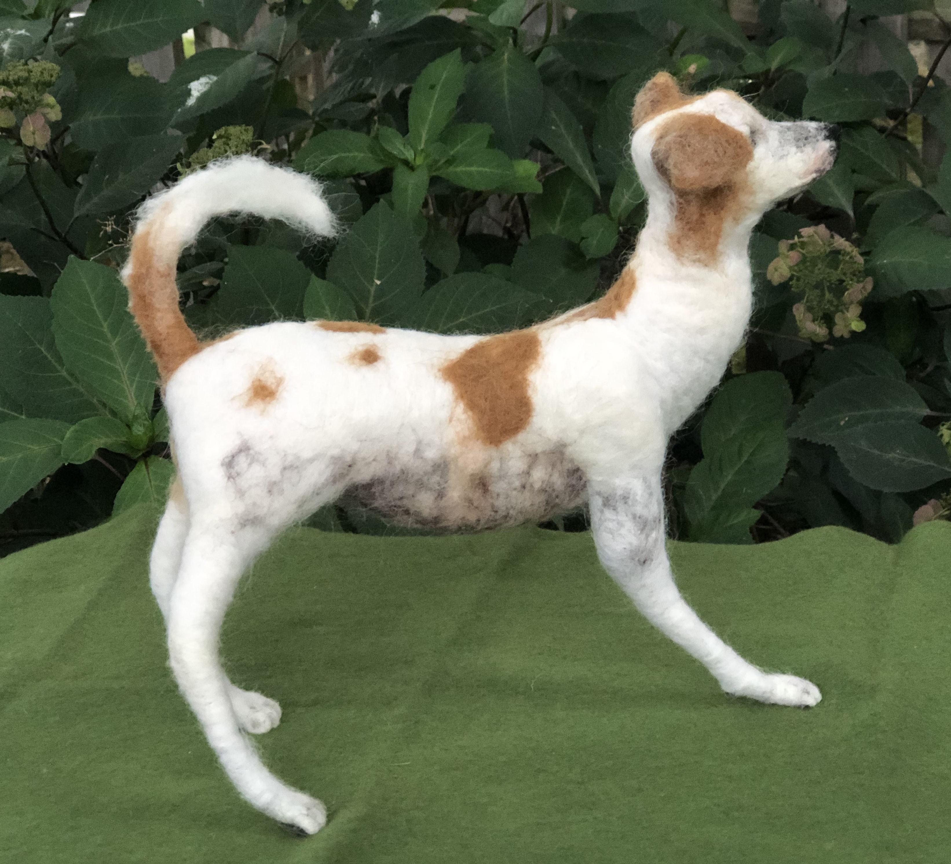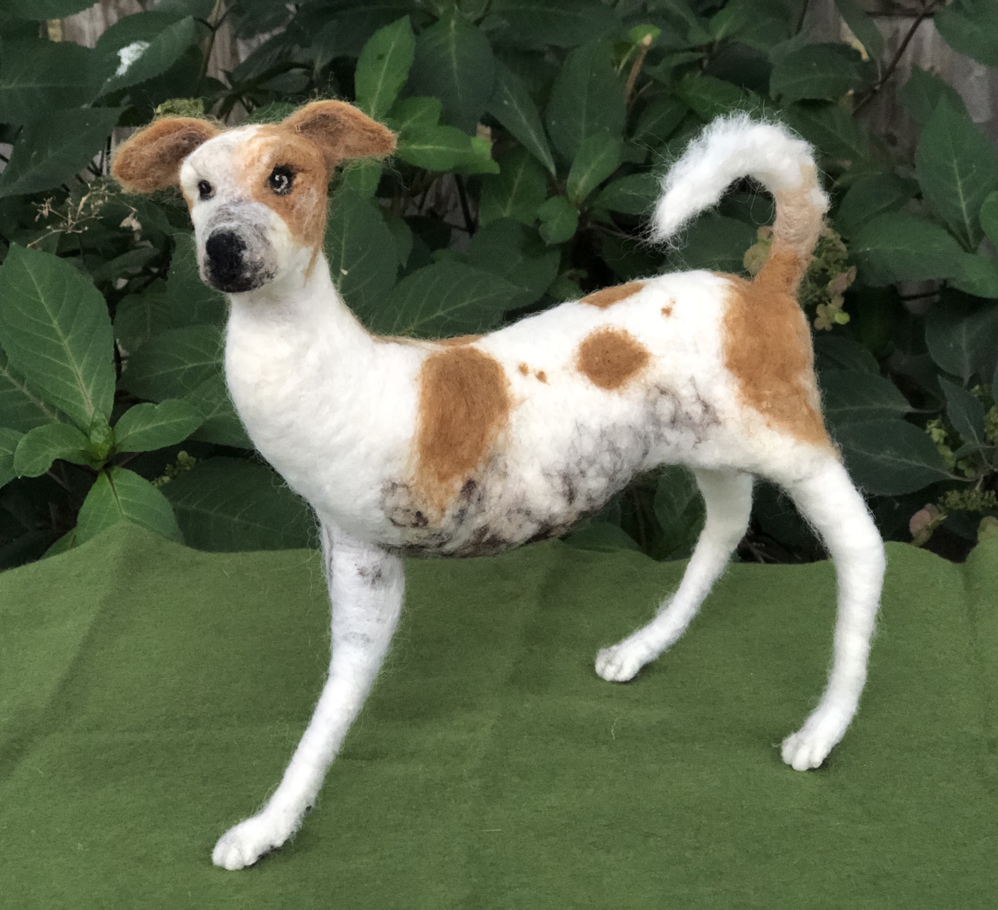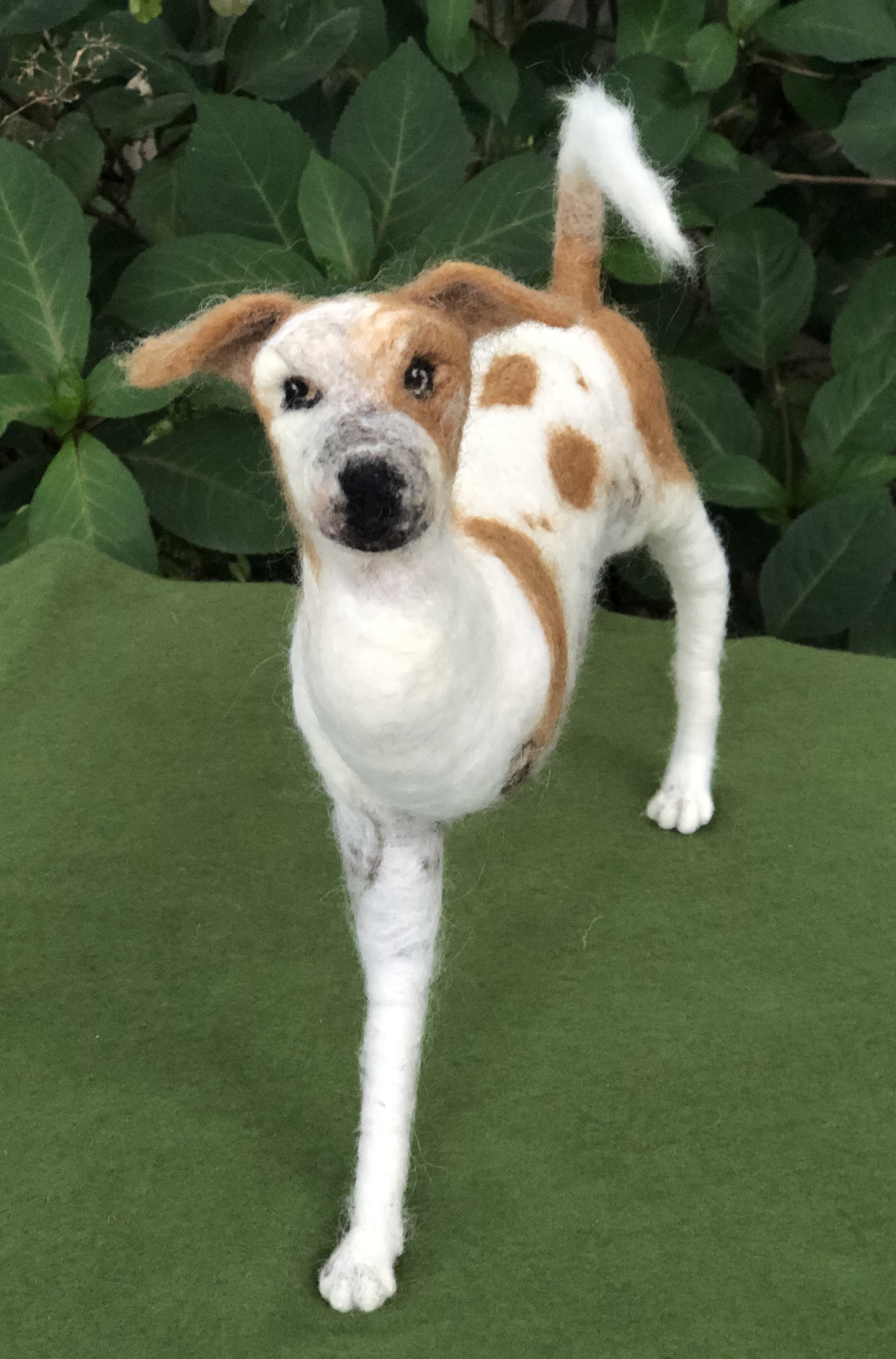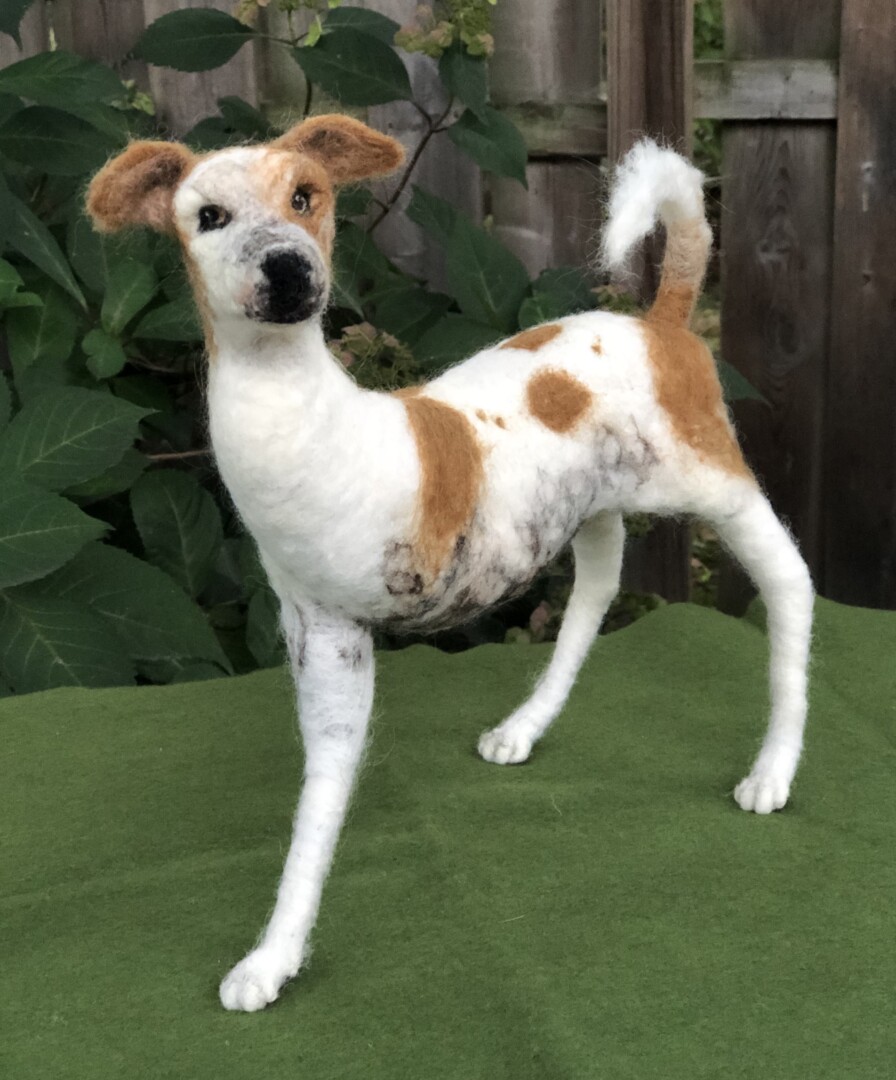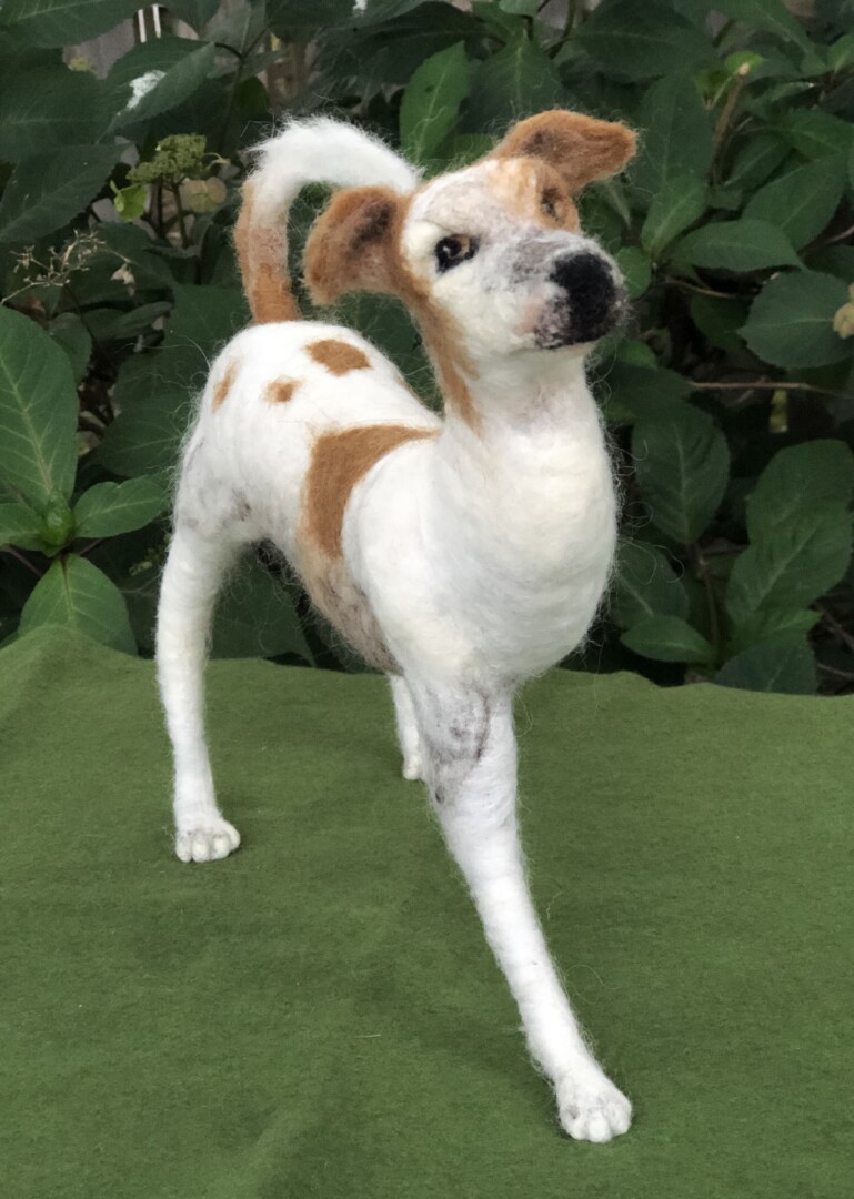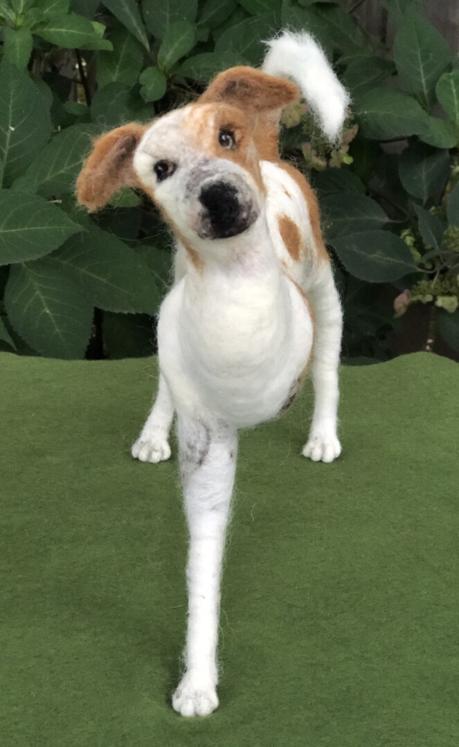 This is a portrait dedicated to Logan’s spirit of resilience. At three months of age, Logan was hit by a car while on the streets of India. Two surgeries were needed to amputate his injured limb. He now thankfully lives with us, and every day he embodies determination, love, and hope. He shines on all who meet him. Needle felted wool over a wire armature.