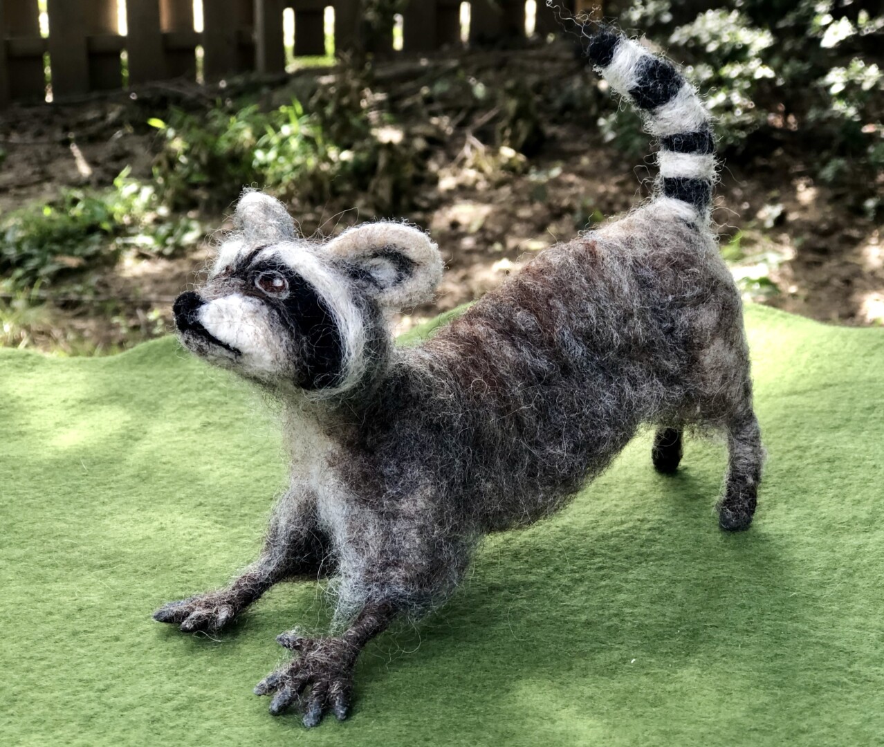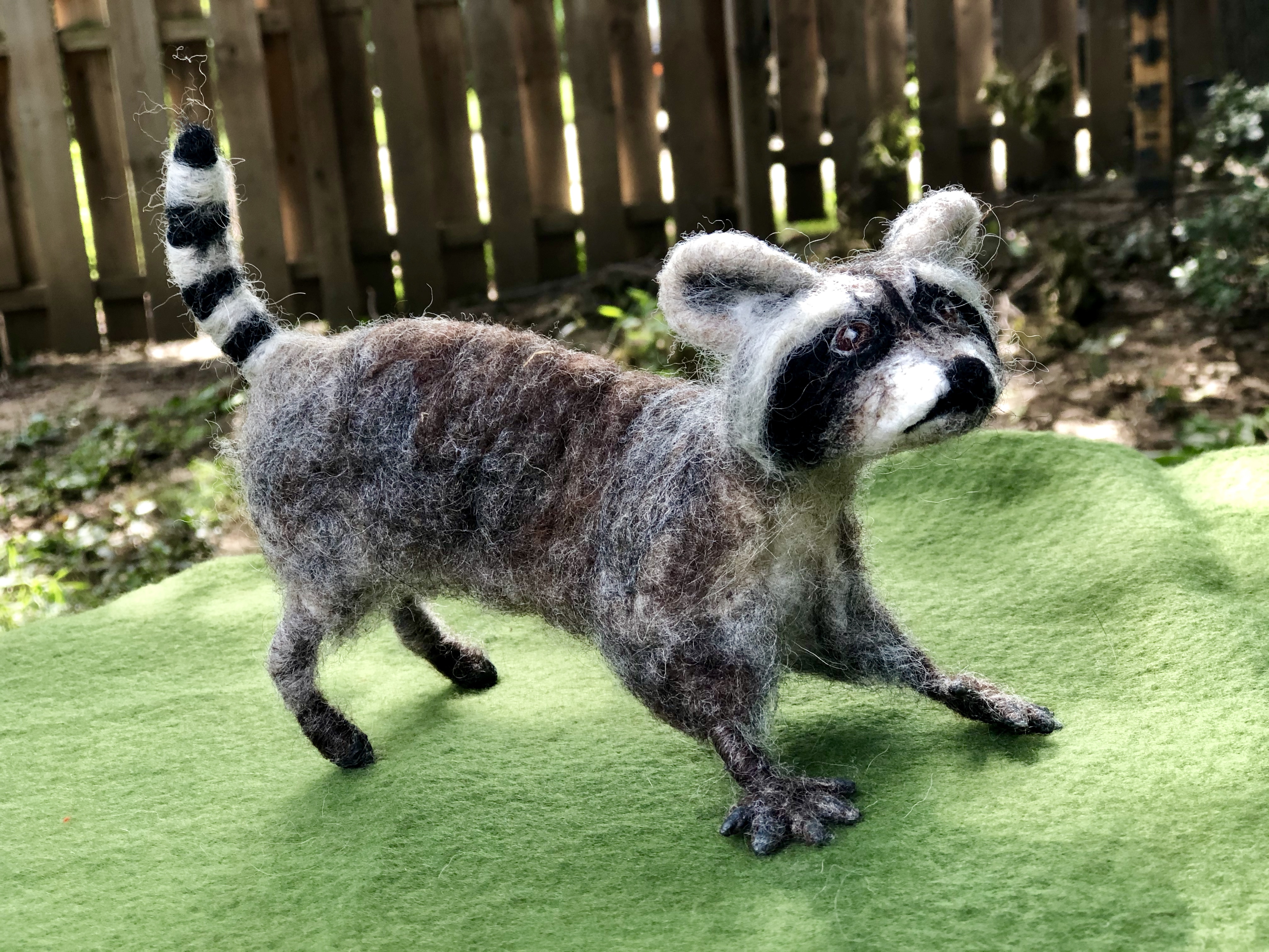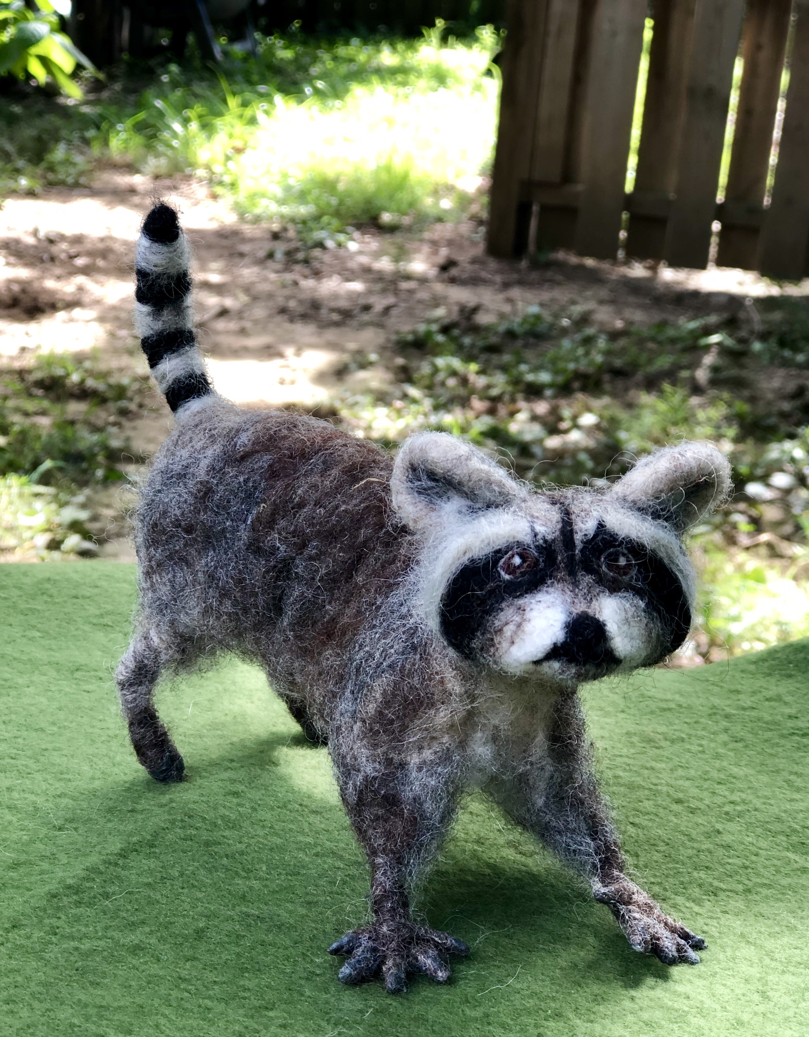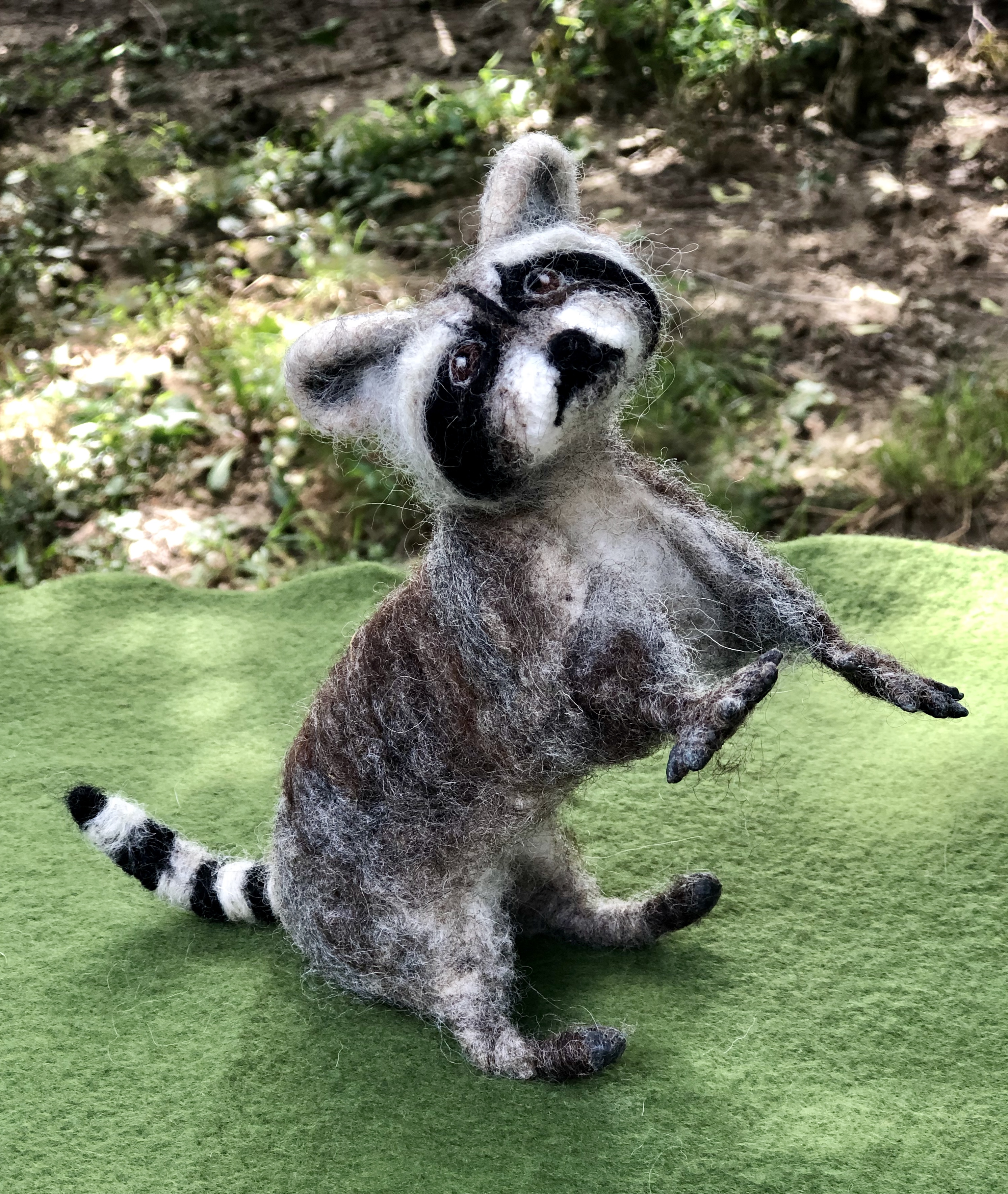 Needle felted raccoon modeled after the Sarafina Fiber Art raccoon. Wool over a wire armature.