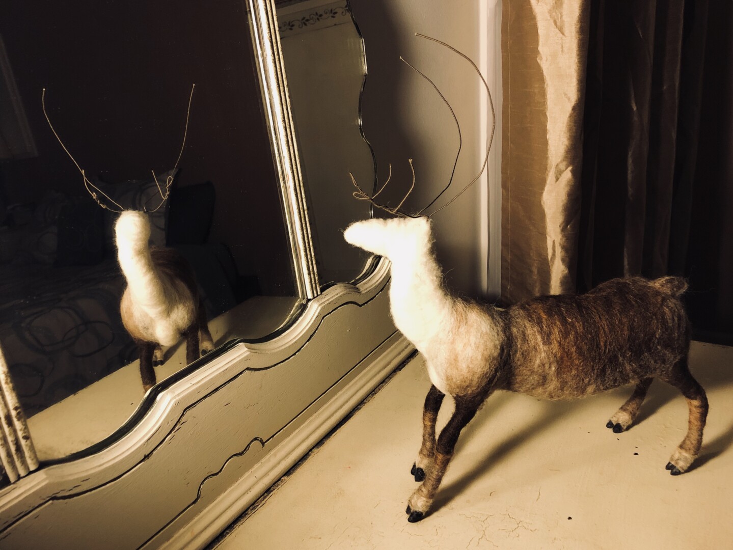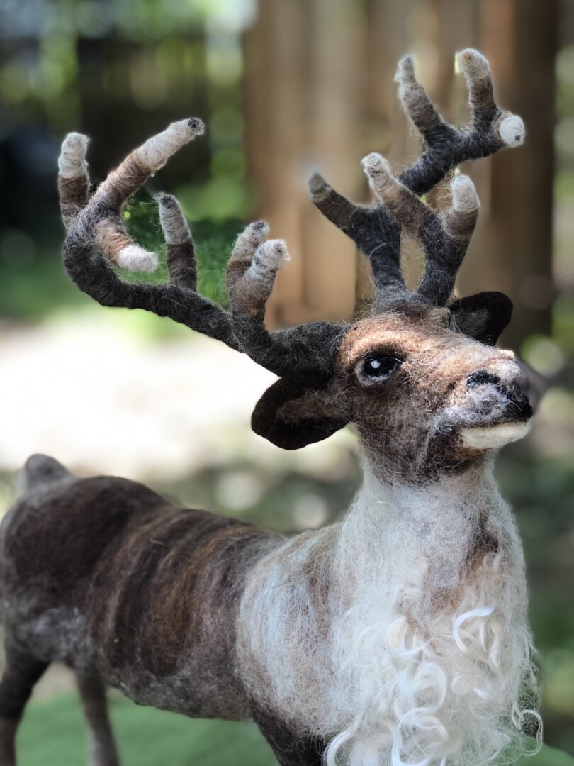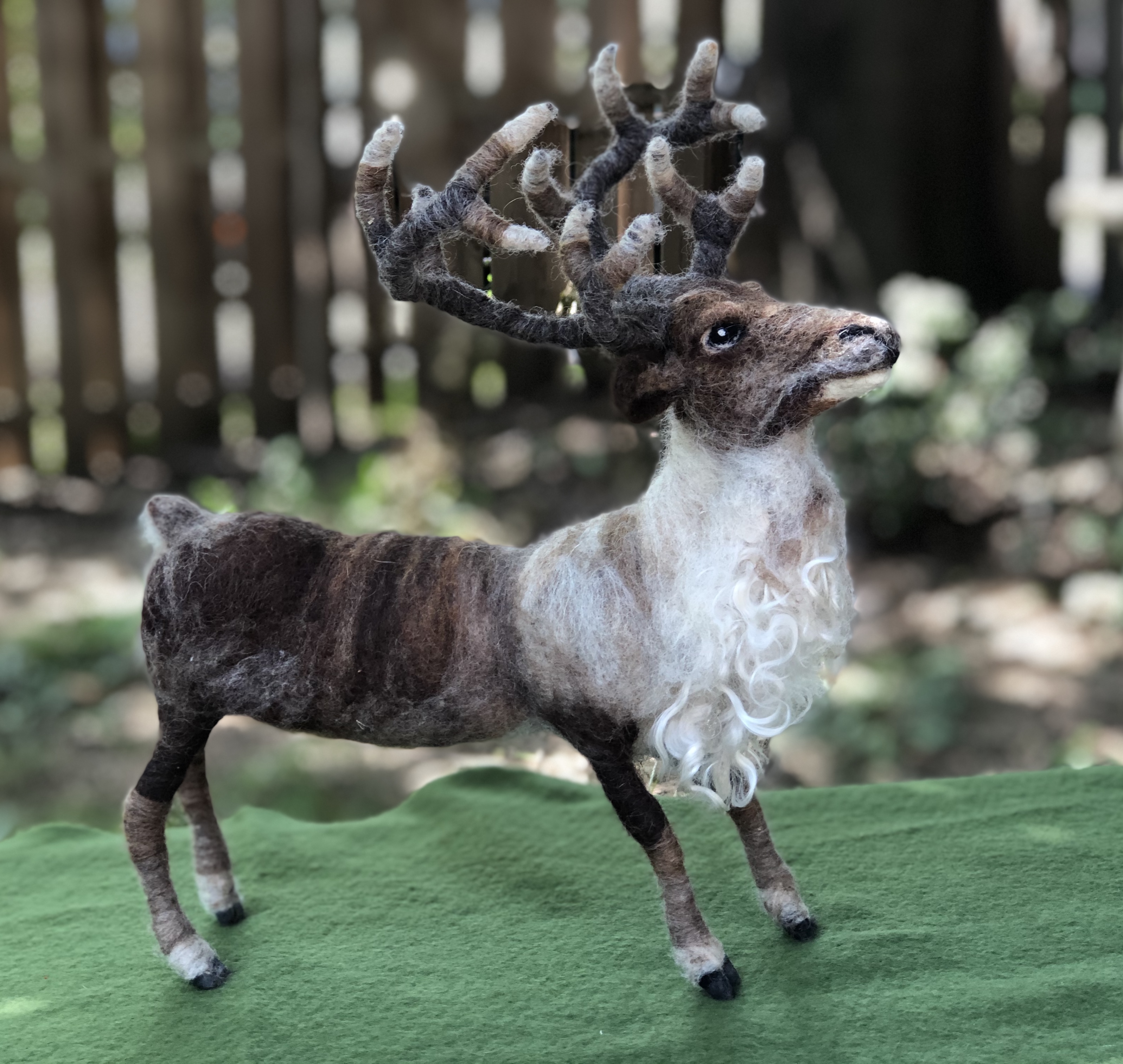 My first needle felted reindeer modeled after the Sarafina Fiber Art reindeer. Needle felted wool over a wire armature.