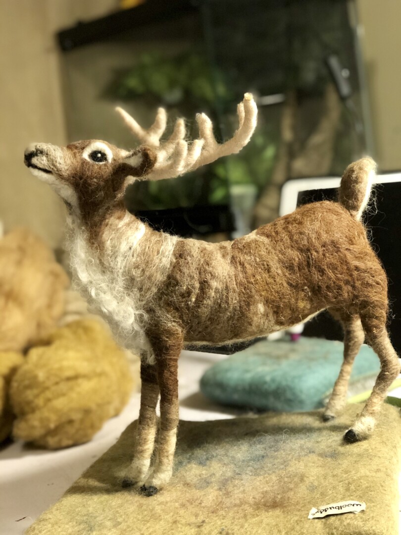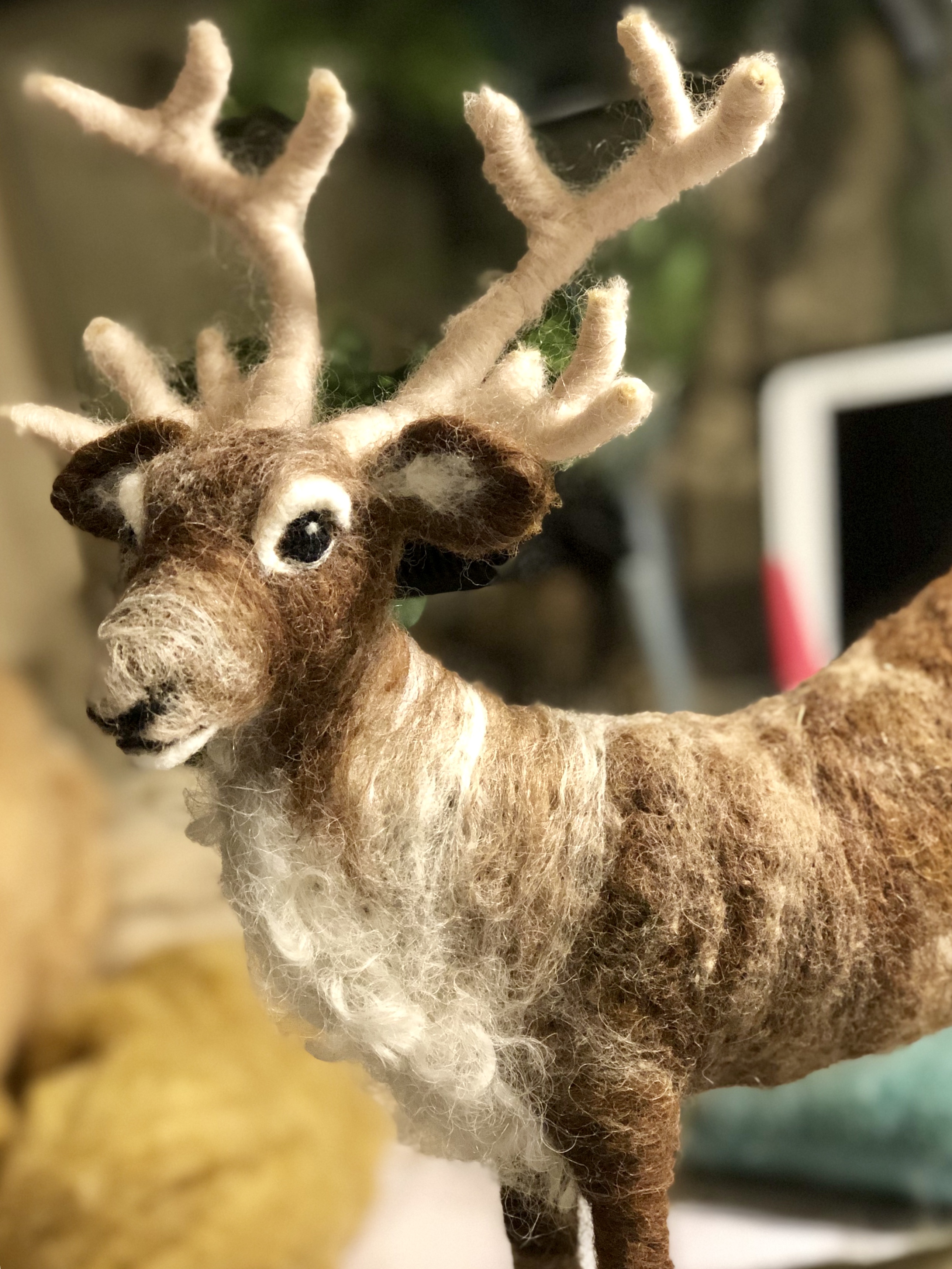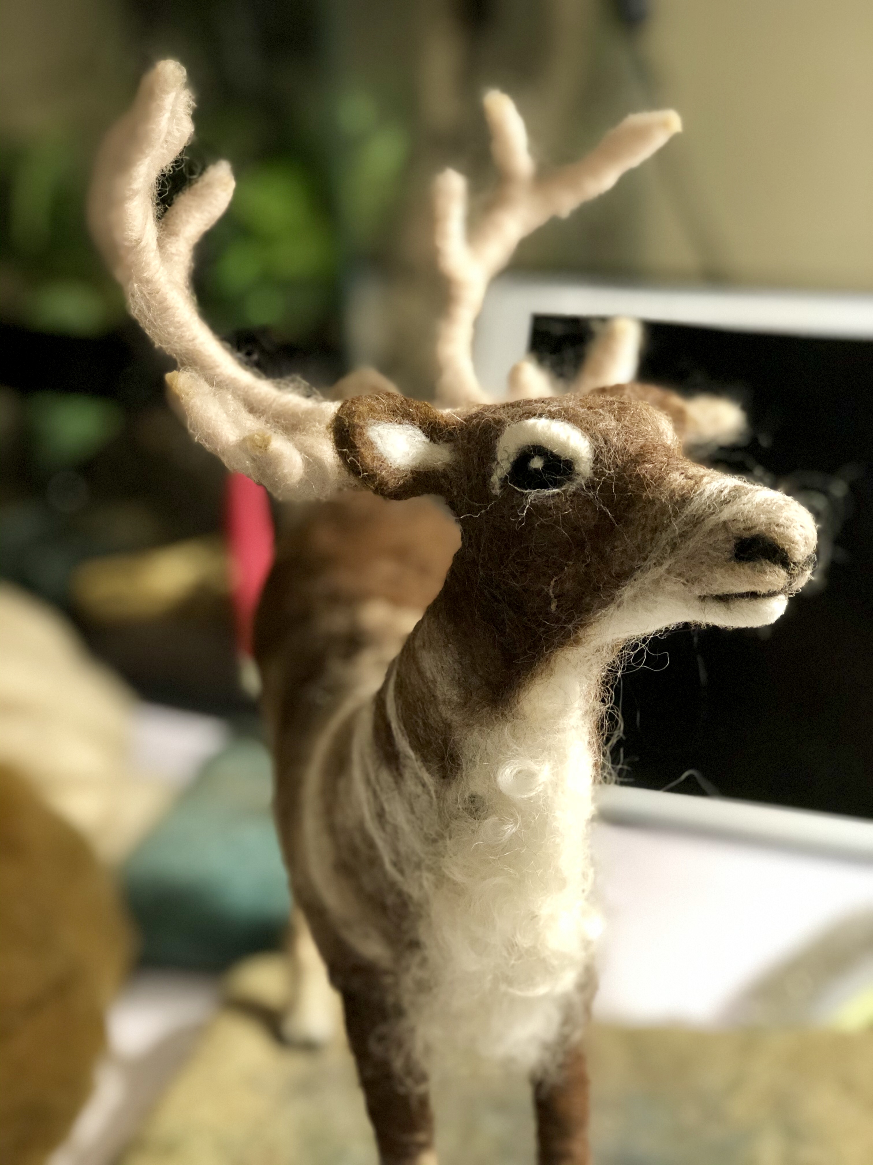 The second needle felted reindeer I made, for my mom. I believe he’s so much sweeter looking than the first one I made, and more appropriate for the recipient because of this. Needle felted wool over a wire armature.
