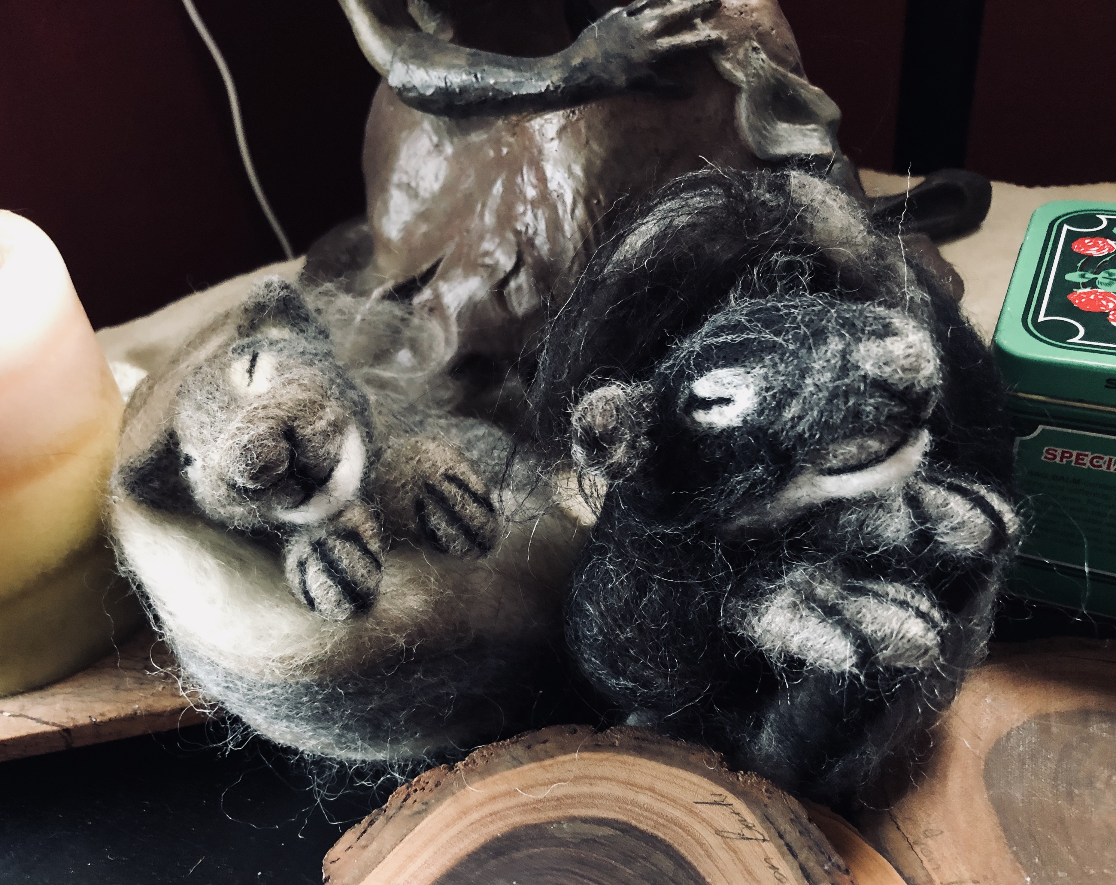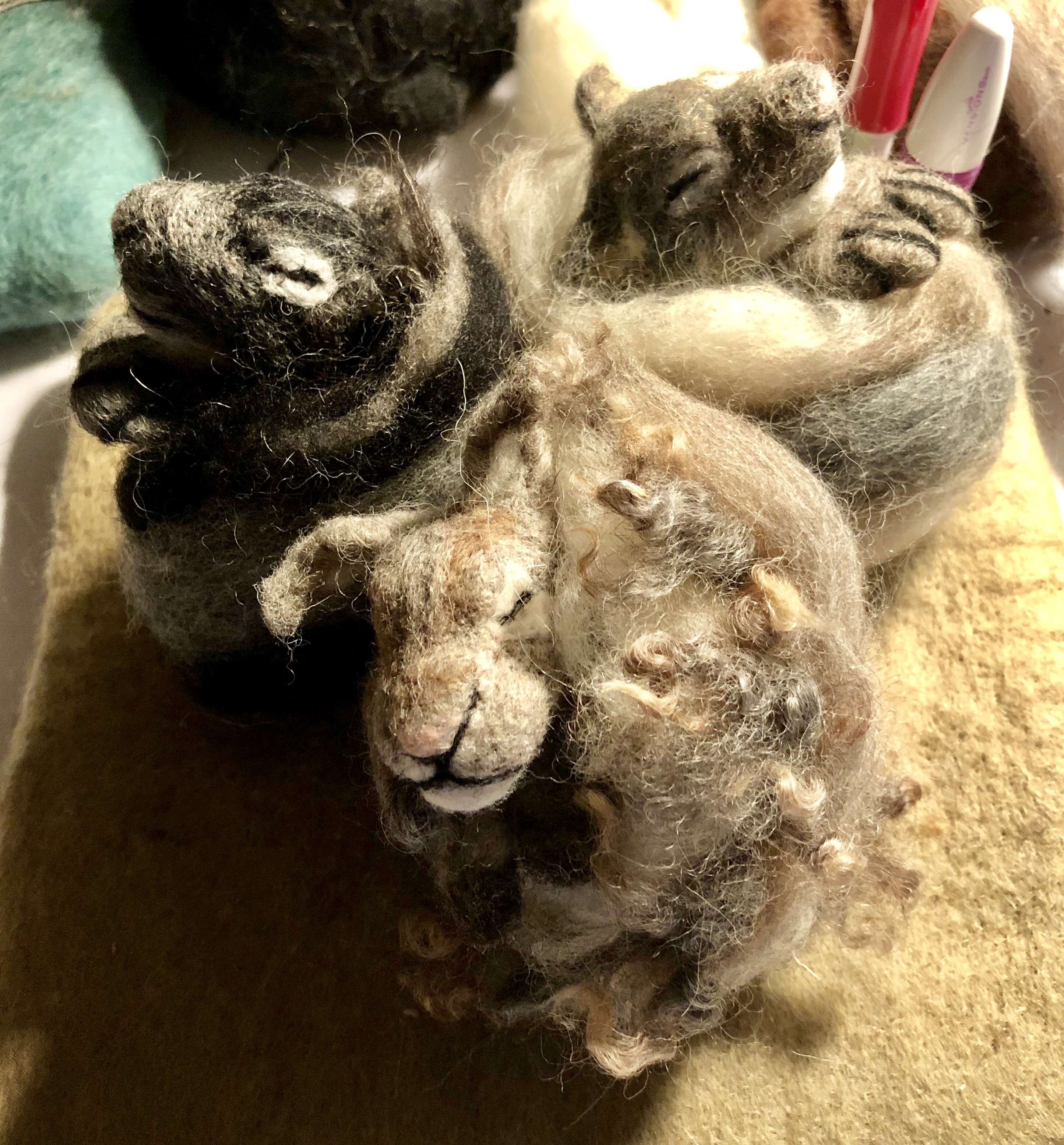 Needle felted baby squirrels modeled after the Sarafina Fiber Art sleepy squirrels. Wool over a single wire.