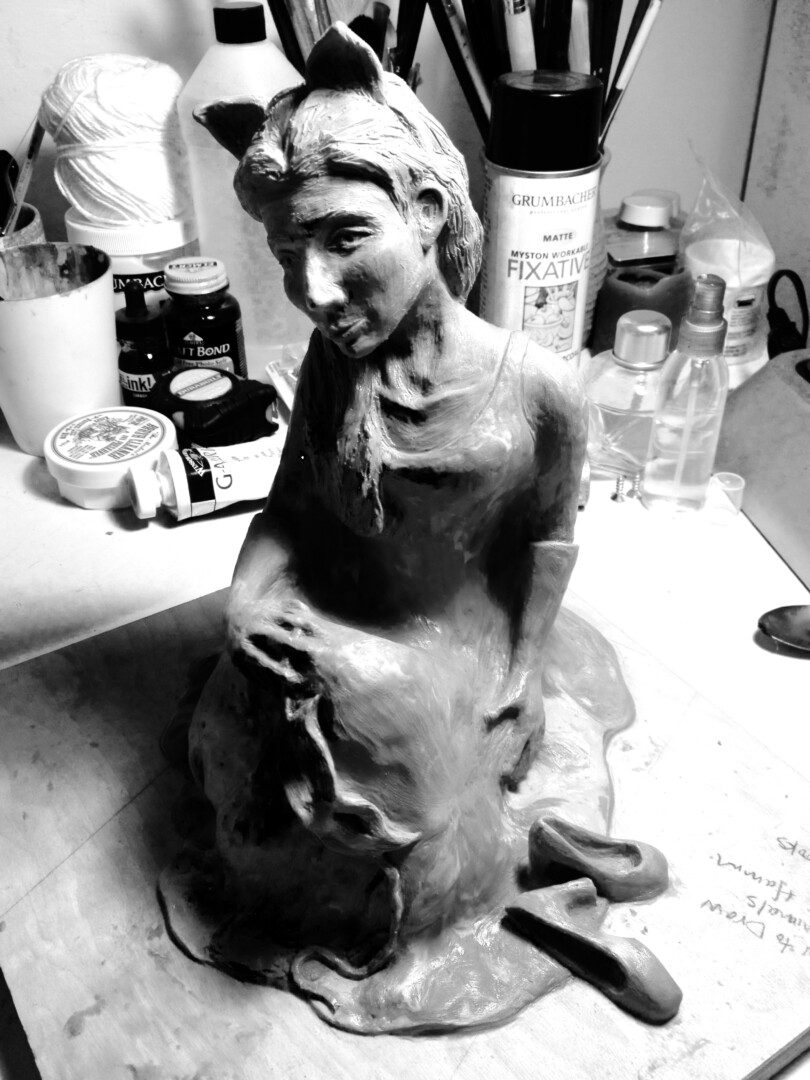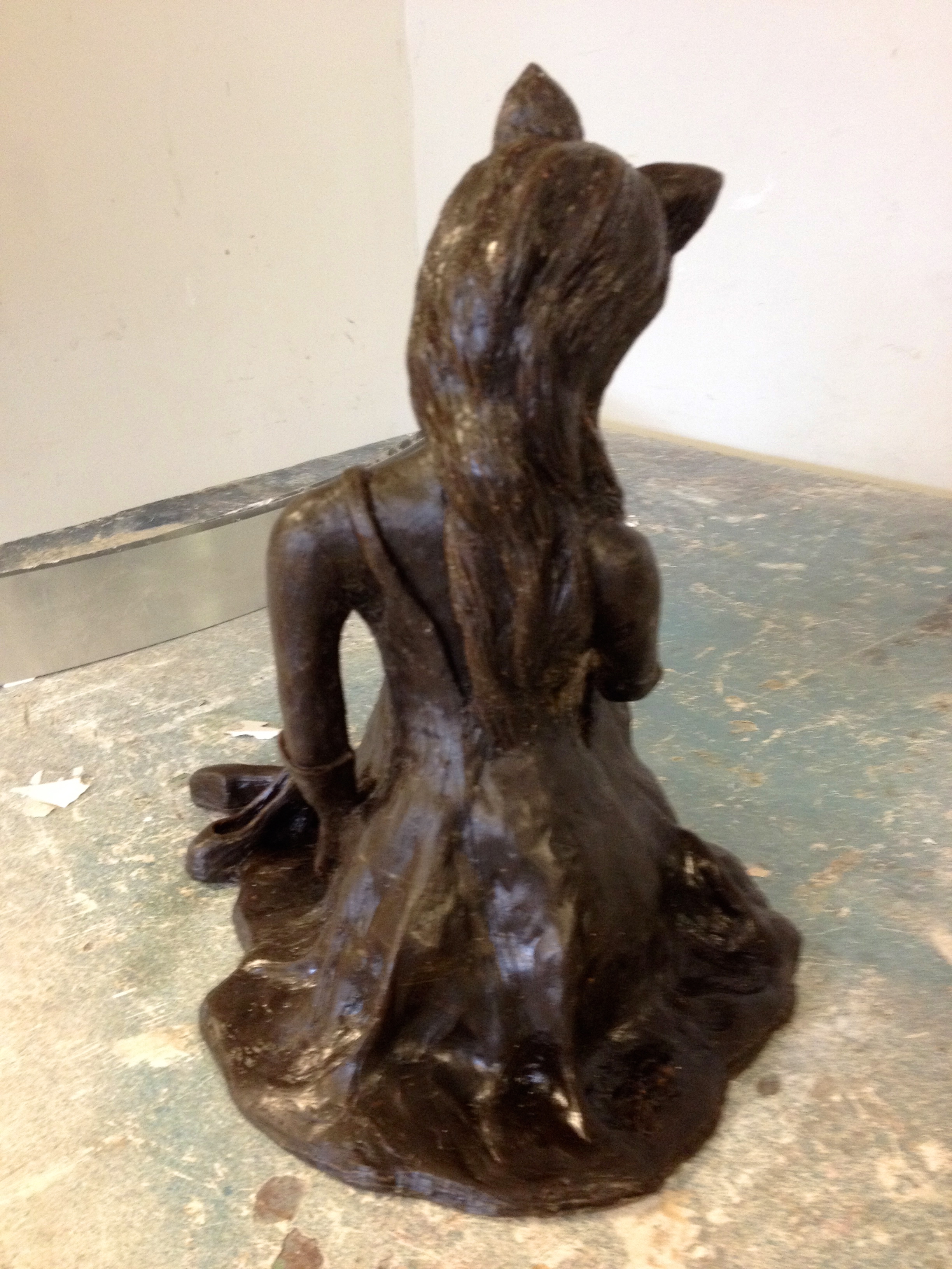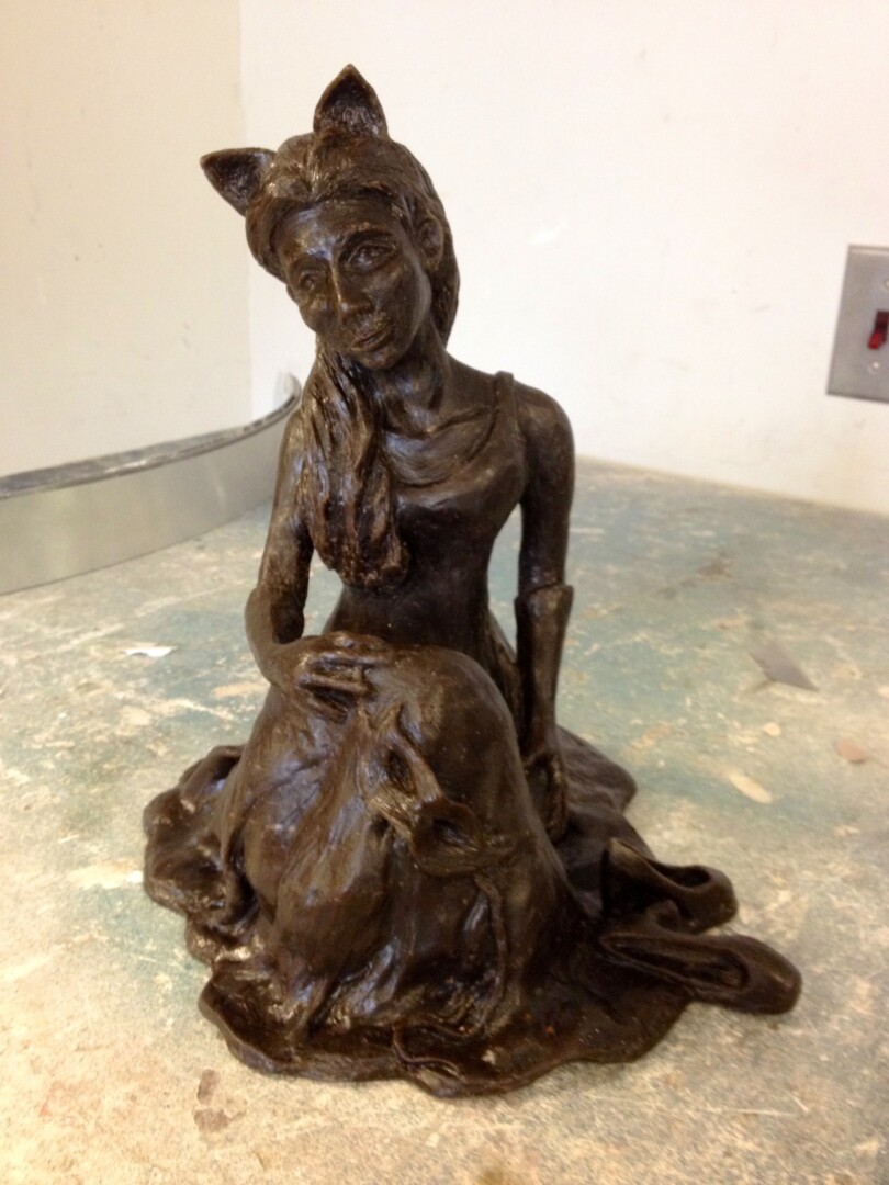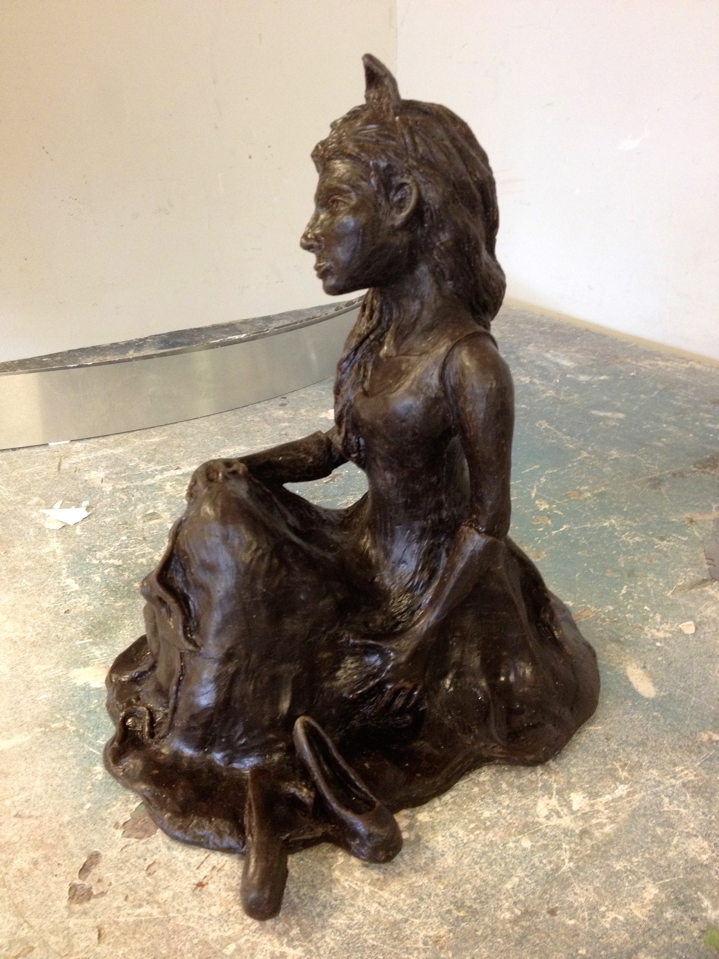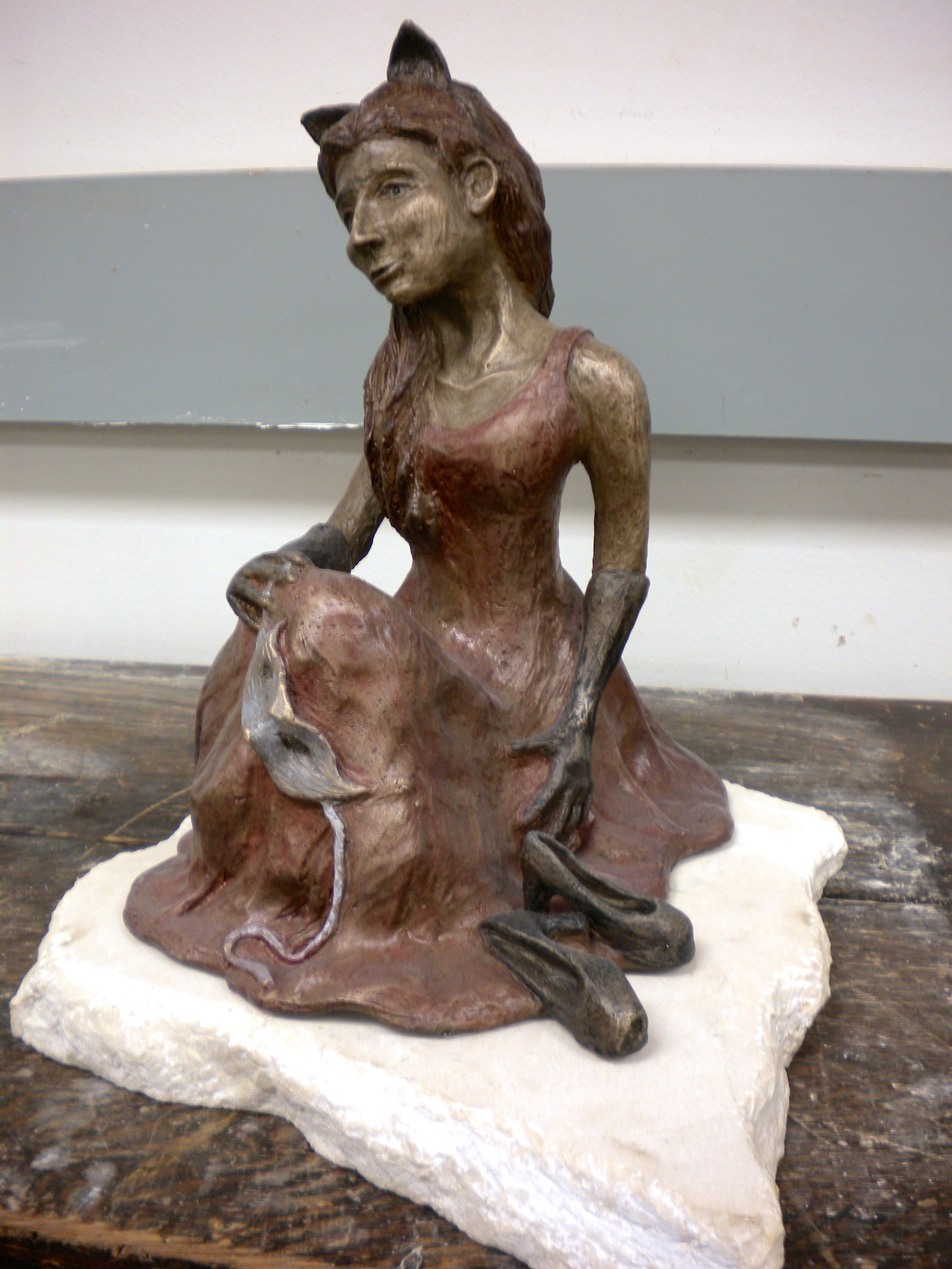 Once so fond of masquerading, this girl is now exhausted from all that she was hiding behind. Bronze sculpture mounted on a marble base.