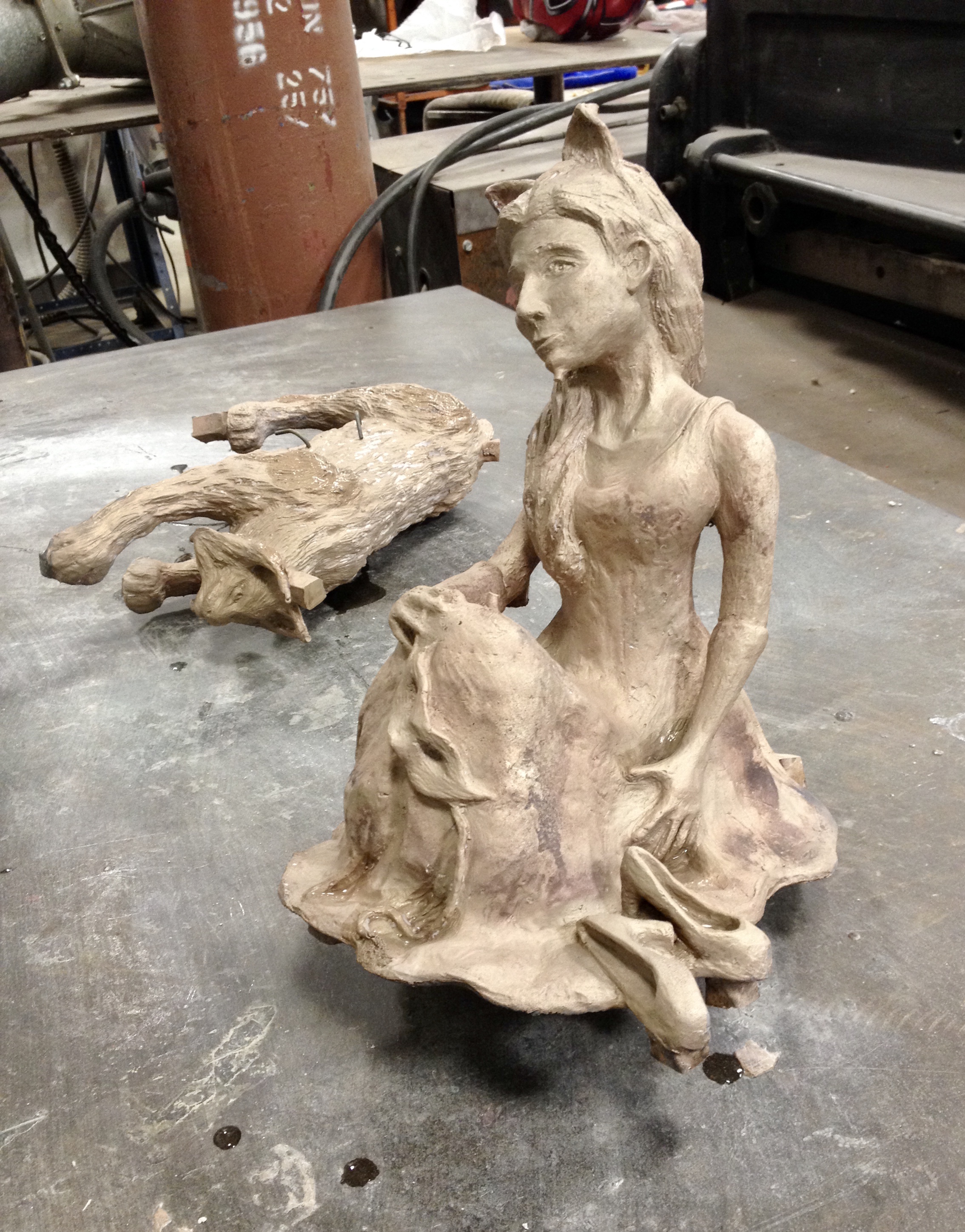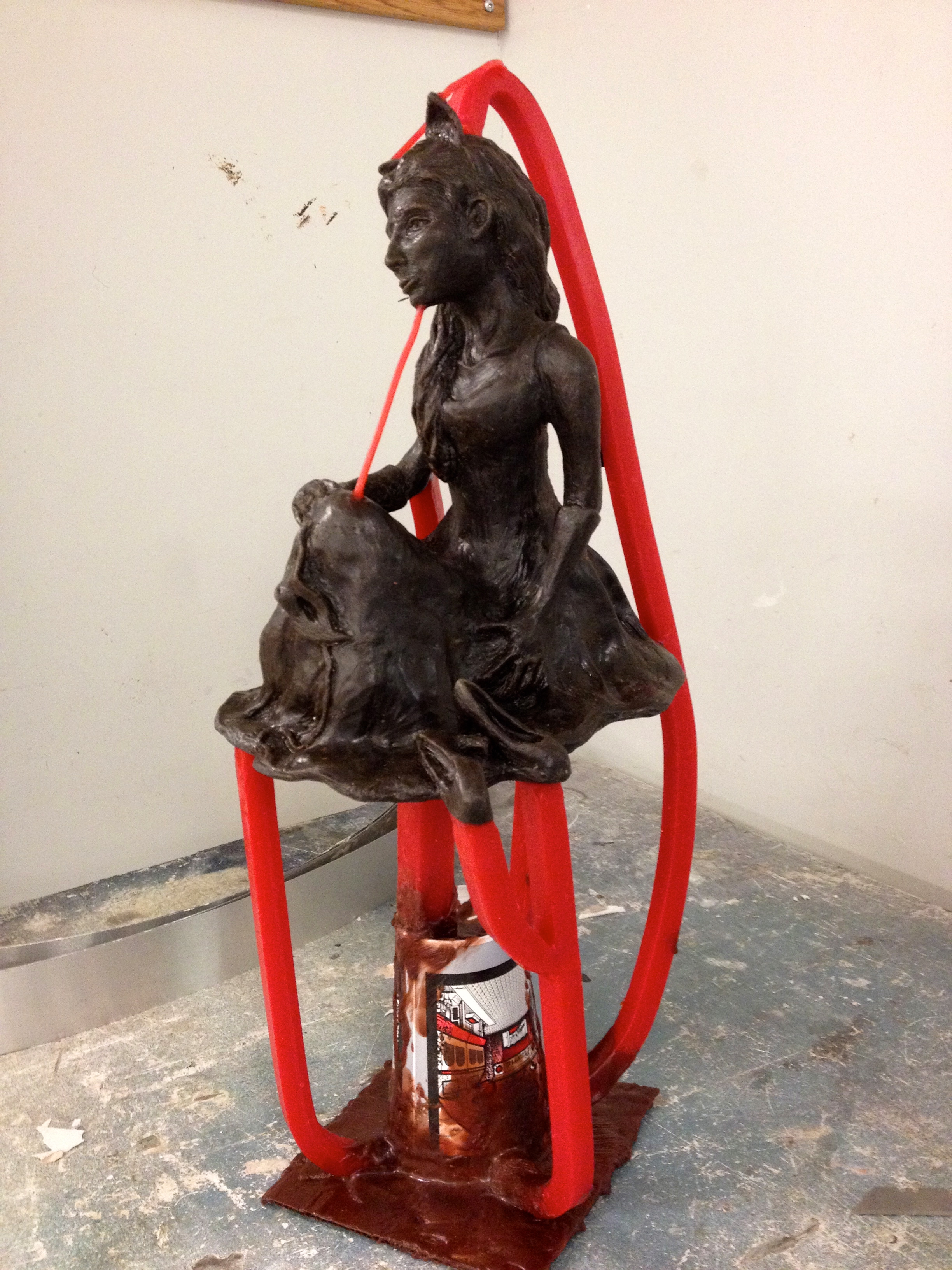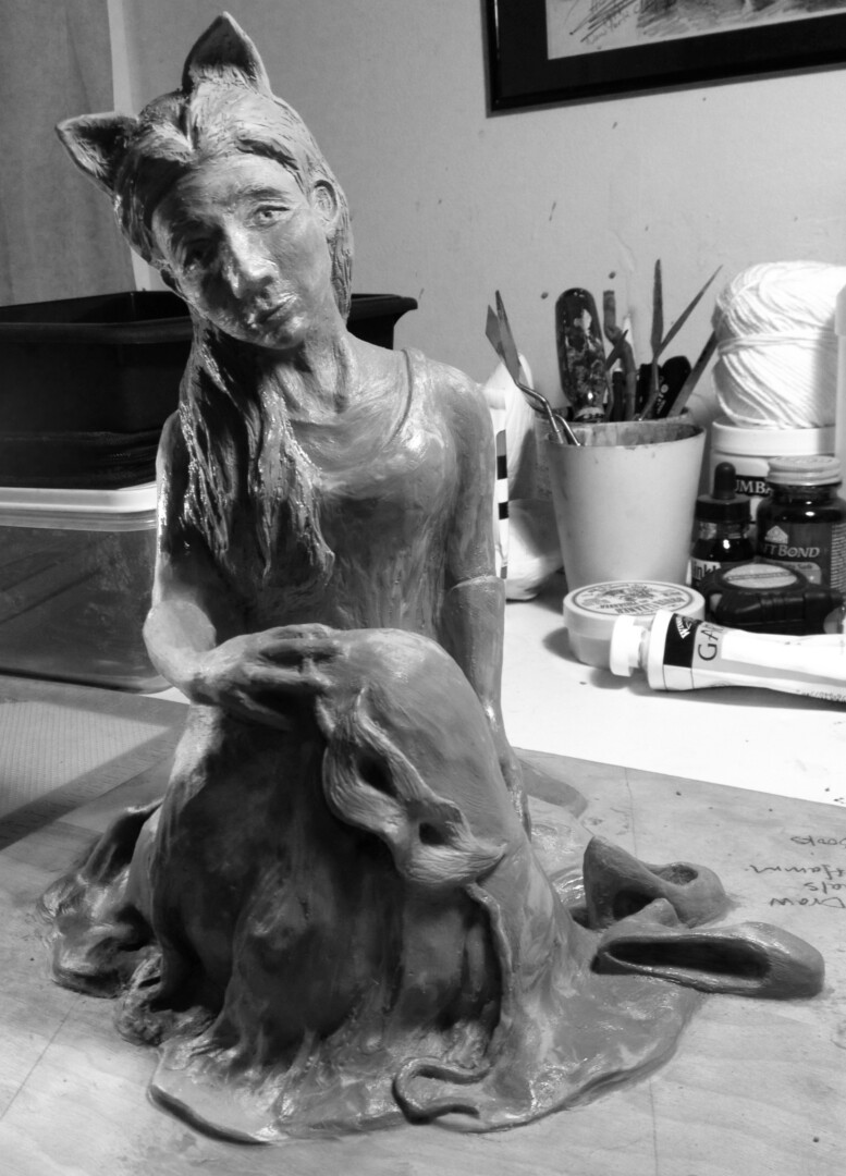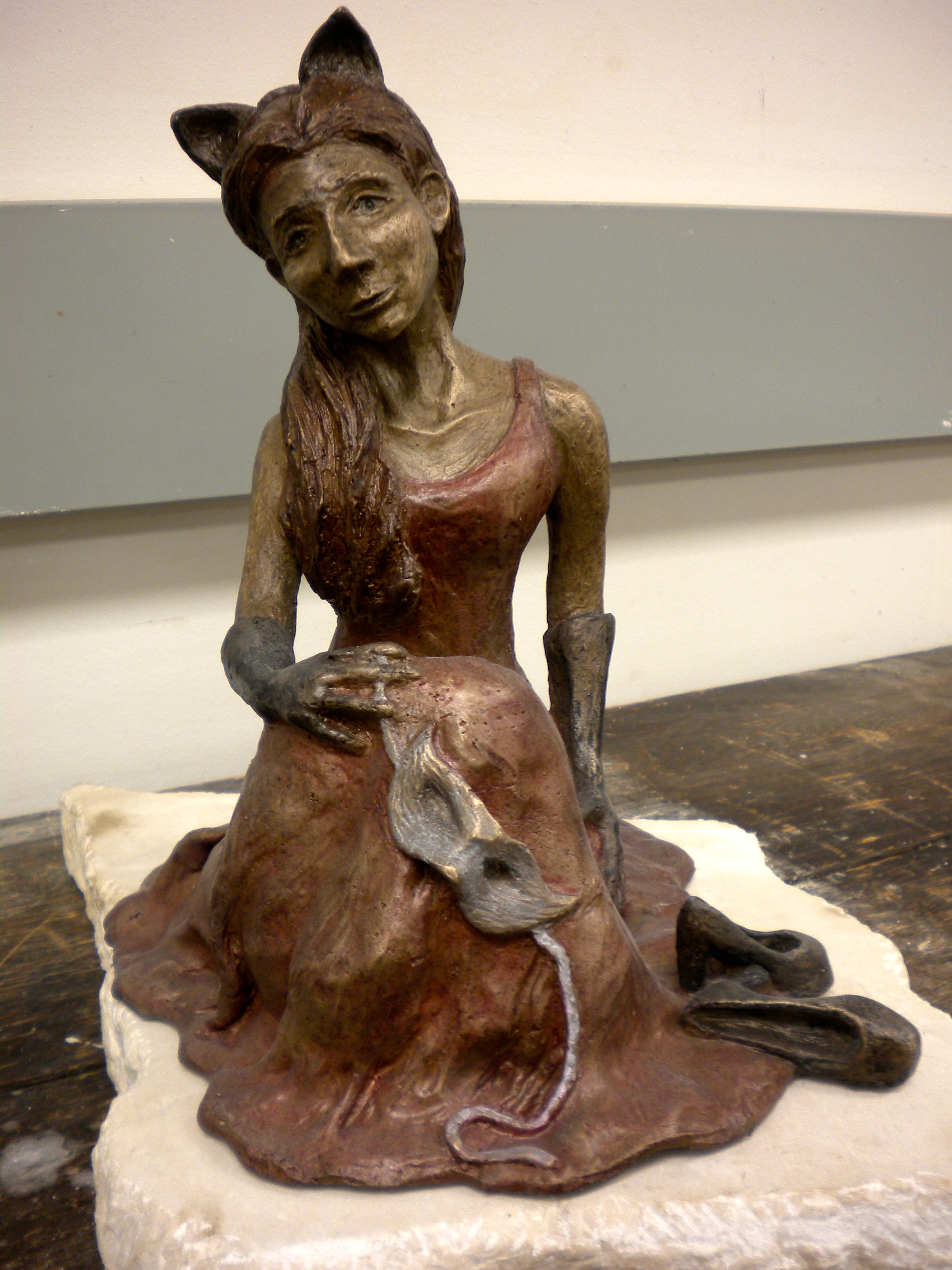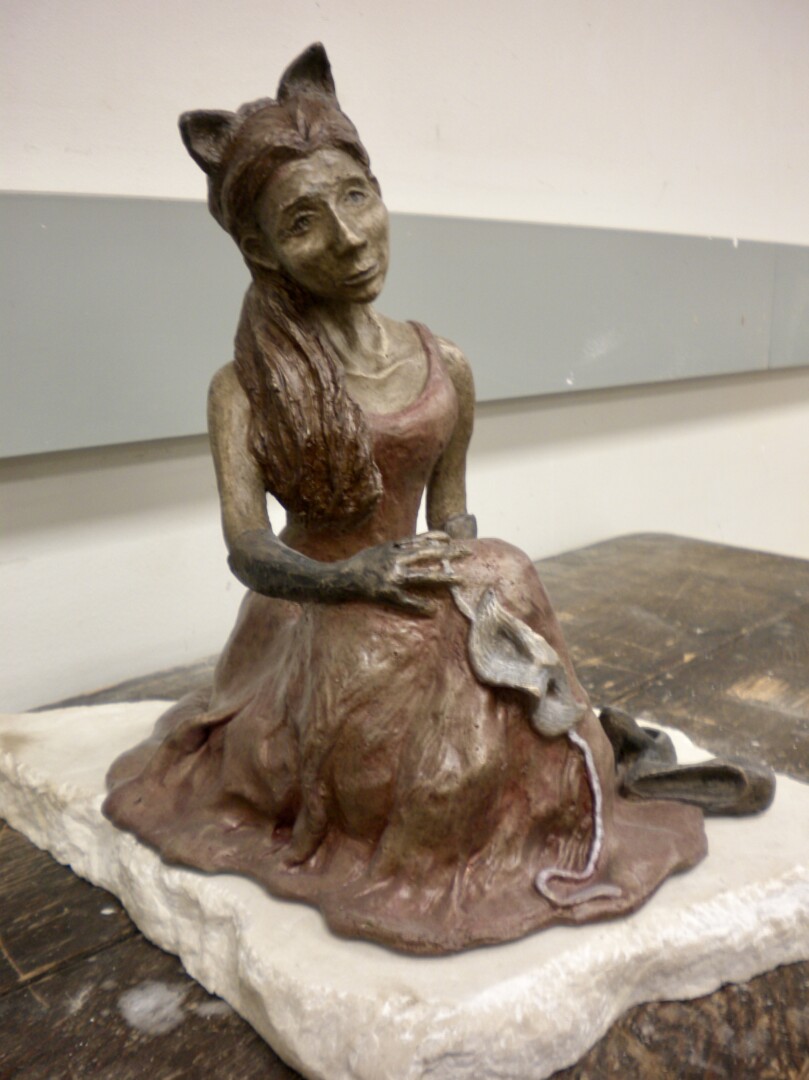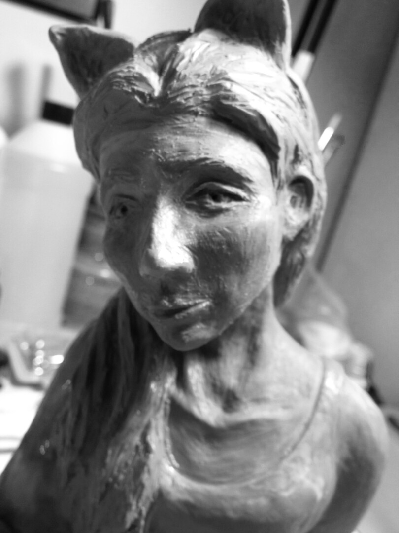 Once so fond of masquerading, this girl is now exhausted from all that she was hiding behind. Bronze sculpture mounted on a marble base.